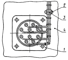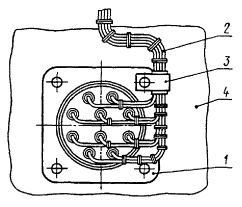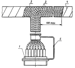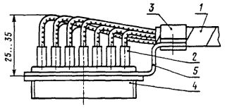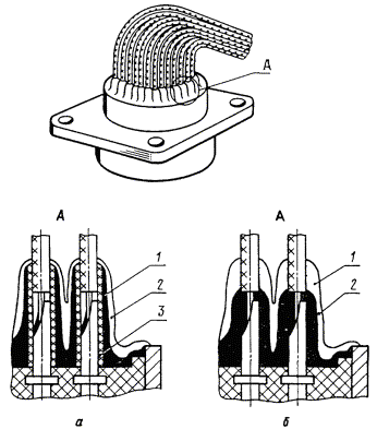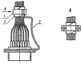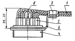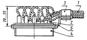 1 - соединитель; 2 - отверстие для крепления жгута; 3 - нитки или шнур; 4 - панель Черт. 4 1 - скоба; 2 - кронштейн; 3 - изоляционная прокладка Черт. 5 1 - жгут; 2 - изоляционная трубка; 3 - скоба; 4 - соединитель; 5 - кронштейн Черт. 6 13. Укладка проводов с полиэтиленовой и фторопластовой изоляцией МПМ, МПКМ, МС16-13 и МГТФ должна соответствовать черт. 6. (Измененная редакция, Изм. № 1). 14. Укладка проводов с поливинилхлоридной изоляцией площадью сечения не более 0,20 мм2 должна соответствовать черт. 7. 15. Рихтовка проводов после пайки не допускается. 16. Перемычки в соединителе, выполненные монтажным проводом, следует выводить петлей в жгут. Петли перемычек следует располагать ступенчато. Длина петли перемычки в этом случае не должна превышать 100 мм от крепления жгута у соединителя. Необходимость введения перемычек петлей в жгут определяет разработчик конструкторской документации. (Измененная редакция, Изм. № 2). 17. Перемычки выполняются в соответствии с черт. 8 только при заливке соединителей компаундом или герметиком. Петли должны быть минимального размера, позволяющего на контакты соединителя надеть изоляционные трубки. 1 - жгут; 2 - изоляционная трубка; 3 - скоба; 4 - соединитель; 5 - кронштейн Черт. 7 1 - жгут; 2 - изоляционная трубка; 3 - скоба; 4 - соединитель; 5 - кронштейн; 6 - перемычка Черт. 8 18. При большом количестве перемычек в соединителе и малом количестве цепей (до 10 цепей) перемычки следует выводить ступенчато в ствол жгута в соответствии с черт. 9. Длина части перемычки в стволе жгута не должна превышать 100 мм. 19. Заливка или обволакивание монтажной части соединителя для защиты от пыли и влаги производится герметиком или компаундом согласно черт. 10. 20. Провода при монтаже не должны иметь повреждений (поджогов, надрезов) и других дефектов, снижающих механическую и электрическую прочность. 21. Провода к контактам соединителей должны подходить свободно без натяжения, быть отрихтованы и иметь запас по длине на перепайку в соответствии с требованиями п. 35. При заливке компаундом запас может отсутствовать. 22. Зачистку проводов или кабелей от изоляции следует производить на длину 15 - 18 мм. 23. Жилы проводов следует скрутить в сторону повива, облудить и отрезать в размер. 24. Монтаж соединителей с плавающими контактами не допускается производить жесткими однопроволочными проводами. 1 - соединитель; 2 - цепи жгута; 3 - перемычки; 4 - жгут; 5 - кронштейн Черт. 9 1 - первый слой герметика; 2 - второй слой герметика; 3 - изоляционная трубка Черт. 10 25. Монтаж, заливку и обволакивание соединителей с плавающими контактами следует производить с технологической ответной частью. 26. При заделке в соединители экранированных проводов, разделанных по ГОСТ 23585, не допускается, чтобы оплетка экранов этих проводов входила в изоляционные трубки, надеваемые на контакты соединителей. 27. Перед пайкой концы проводов жгута следует продеть в отверстие специального шаблона (имитатор контактного поля соединителя) для предупреждения перекрещивания проводов в зоне монтажа. 28. Перед пайкой в контакты соединителей на провода должны быть надеты изоляционные трубки диаметром, обеспечивающим плотную посадку их после пайки на контакте и (или) проводе (проводах). Если соединители подлежат заливке или обволакиванию, то возможны два варианта монтажа: а) с трубками; б) без трубок - в соответствии с черт. 10. (Измененная р