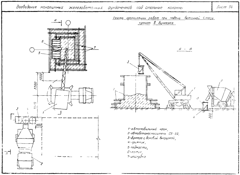 бетонирование фундаментов с помощью крана и бадьи, бетоноукладчика