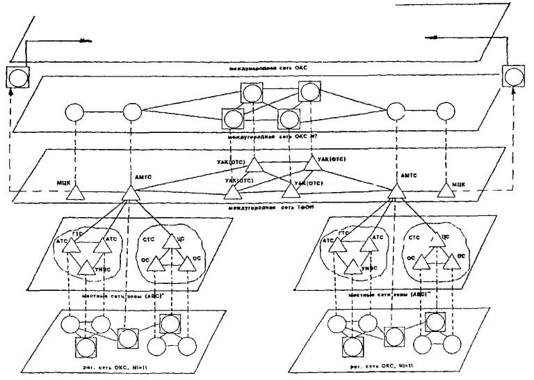 Основные положения системы сигнализации Москва - 1996 Жарков М.А. ЦНИИС заместитель Генерального директора по науке к. т. н., Кучерявый А.Е. ЛОНИИС заместитель директора по научной работе, д. т. н., профессор 1. Назначение системы ОКС № 7Система общеканальной сигнализации ОКС № 7 представляет собой стандартизованную на международном уровне общецелевую систему сигнализации, предназначенную для осуществления обмена сигнальной информацией в цифровых сетях связи с цифровыми программно-управляемыми станциями. Система оптимизирована для работы по цифровым каналам со скоростью 64 кбит/с и позволяет осуществлять управление установлением соединения, а также передачу информации техобслуживания и эксплуатации. Она может также быть использована как надежная транспортная система для передачи других видов информации между станциями и специализированными центрами в сетях телекоммуникаций. Система ОКС № 7 применяется на международной и национальных сетях и взаимодействует с другими системами сигнализации. Система применяется для обслуживания соединений ТфОП, включая ЦСИС, на сетях подвижной связи, для целей техэксплуатации и техобслуживания сетей; осуществляет взаимодействие с сетевыми базами данных и узлами систем управления сетями электросвязи; наличие системы сигнализации № 7 является обязательным условием реализации интеллектуальной сети связи. Таким образом, можно сказать, что система сигнализации ОКС № 7 является ключевым элементом построения современных сетей электросвязи. Рис. 1 Взаимодействие цифровых сетей по ОКС № 7 Представление сети ОКС № 7 как единого транспортного механизма для обеспечения взаимодействия всех типов цифровых сетей показано на рис. 1. 2. Принципы построения и внедрения сети ОКС № 72.1. Рекомендуемые стратегии внедрения системы ОКС № 7При планировании сети целесообразно руководствоваться одной из рекомендованных МСЭ-Т стратегий. Это либо внедрение ОКС № 7 сверху, т.е. с более высокого иерархического уровня, либо снизу, т.е. с нижнего уровня. Третья стратегия - организация так называемых «островов» - допускает более прагматический путь к реализации ОКС № 7. Стратегия «сверху вниз» Реализация системы ОКС № 7 в данном случае вначале осуществляется на высшем уровне сети. Это уровень междугородных станций и узлов (оконечных и транзитных). Дальнейшая интеграция системы ОКС № 7 пойдет вниз по сетевой иерархии к региональным транзитным станциям и до местных станций, в зависимости от скорости цифровизации первичной сети и скорости внедрения новых технологий на местных сетях. Преимуществом стратегии «сверху вниз» является построение базовой платформы, т.е. верхнего транзитного уровня, для дальнейшего расширения сети и внедрения перспективных услуг. Региональные сети могут включаться в разное время по мере готовности. Стратегия «снизу вверх» Реализация сети начинается с нижнего уровня, т.е. с местных сетей. Преимущества этой стратегии состоят в том, что внедрение системы ОКС № 7 во многих регионах сети происходит одновременно и независимо друг от друга, но сеть ограничивается пределами региона (местной, внутризоновой сетями ТфОП, сетями юридических и физических лиц). В данном случае не обязательна координация работ с проектами верхних уровней сетей. Стратегия островов Применение данной стратегии во