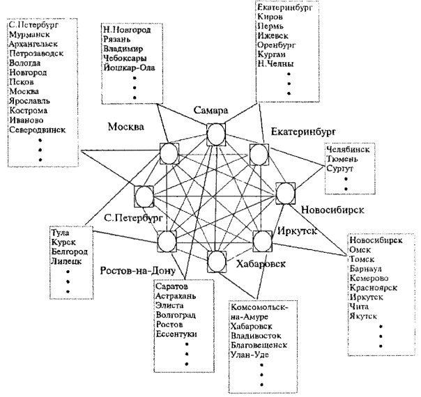 На сети России QoS и GoS параметры могут отличаться от рекомендованных МСЭ-Т и должны быть проведены дополнительные работы по определению значений параметров, допустимых на сети ОКС № 7 Российской Федерации с учетом параметров уже существующей сети. При построении сети ОКС № 7 важным также является вопрос целесообразности организации на национальном уровне сети транзитных пунктов сигнализации с функцией обработки сообщений подсистемы управления сигнальным соединением (узлы SPR) для обеспечения обмена сигнальной информацией между интеллектуальными или подвижными сетями, находящимися в разных междугородных зонах. Вопрос организации сетей, использующих для передачи сообщений пользователя подсистему SCCP должен быть предметом отдельной работы и решен на основе расчетов сети ОКС № 7 с учетом упомянутых выше рекомендаций МСЭ-Т по QoS и GoS параметрам и рекомендации Q.709, задающей нормы на количество транзитных пунктов в сигнальном соединении. Кроме того, должны быть учтены новые рекомендации для ИСС. 2.2.3. Структура сети ОКС № 7 для зоновых и местных сетей 2.2.3.1. Сети ОКС № 7 на городских телефонных сетях В настоящее время принята следующая стратегия внедрения электронных АТС (АТСЭ) на ГТС: - АТСЭ внедряется методом наложенной сети; - на ГТС без узлообразования АТСЭ внедряются как отдельные станции; связь с существующими АТС может осуществляться через отдельные АТСЭ, выполняющие роль шлюзов; - на ГТС с узлообразованием организуются отдельные цифровые узловые районы, кратные 100-тысячной емкости, для которых выделяются индексы b или ab из номерной емкости зоны. В отдельных узловых районах организуются электронные узлы (УВСЭ), предназначенные, главным образом, для связи с существующими АТС и УВС. При организации сети ОКС № 7 на ГТС необходимо иметь в виду следующее: - существующие АТС внутри отдельного узлового района связываются между собой цифровыми первичными трактами напрямую; - цифровые АТС разных узловых районов связываются между собой или напрямую, или через УВСЭ; выбор способа связи зависит как от емкости цифровой ГТС, так и от емкости АТС. На некоторых ГТС при малой емкости АТСЭ (до 20 тыс. номеров) возможна также связь и через узел исходящих сообщений. При построении сети ОКС № 7 на ГТС следует иметь в виду, что сеть ОКС № 7 должна быть в основном связанной; квазисвязанный способ должен быть предназначен для работы в аварийной ситуации или при перегрузках, поэтому всегда должны предусматриваться альтернативные маршруты. На ГТС без узлообразования связь между пунктами сигнализации осуществляется по принципу «каждый с каждым». На некоторые АТС могут быть возложены функции транзитных пунктов сигнализации для обеспечения альтернативных маршрутов. На ГТС с узлообразованием внутри узлового района между АТСЭ должны быть организованы прямые звенья сигнализации. Прямые звенья ОКС № 7 могут быть организованы и между АТСЭ разных узловых районов при наличии достаточной нагрузки. На узловые станции должны быть возложены функции транзитных узлов коммутации, выполняющие следующие функции: - обеспечение связи в нормальной ситуации между АТСЭ разных узловых районов в случае малой нагрузки; - обеспечение связи в аварийной ситуации. 2.2.3.2. Сети ОКС № 7 на сельских телефонных сетях Сельские телефонные сети Российской Федерации строятся по р