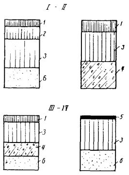 8. В IV-V дорожно-климатических зонах на дорогах III-IV категории при устройстве основания из высокопористого зернистого асфальтобетона допускается замена покрытия из плотного асфальтобетона слоем износа, устраиваемым способом поверхностной обработки из высокопрочного щебня. 9. Схемы конструкций дорожных одежд с основаниями из высокопористого асфальтобетона приведены на рис. 1. 10. При применении в основаниях крупно- или среднезернистого высокопористого асфальтобетона покрытие рекомендуется проектировать минимальной конструктивной толщины, а при устройстве основания из высокопористого песчаного асфальтобетона толщина покрытия (из зернистого асфальтобетона) должна быть не менее 10 см на дорогах I-II категорий и на городских магистралях, проектируемых под автомобильную нагрузку Н-30 и Н-10, и не менее 6 см на дорогах III-IV категорий. 11. Конструкция дорожной одежды должна удовлетворять требованиям по прочности «Инструкции по проектированию порожных одежд нежесткого типа» ВСН 46-72. Рис. 1. Схемы конструкций дорожных одежд с основаниями из высокопористого асфальтобетона для дорог I-IV категорий: 1 - асфальтобетон плотный; 2 - асфальтобетон пористый; 3 - асфальтобетон высокопористый; 4 - щебень или гравий; 5 - поверхностная обработка; 6 - песок (дополнительный слой основания) Показатели расчетного модуля упругости высокопористого асфальтобетона Е приведены в табл. 2. Таблица 2