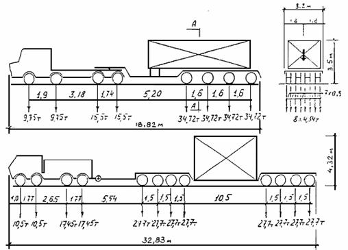 Примечания: 1. Для одиночных автомобилей (тягачей) не допускается превышение полной массы более 30 т. 2. Предельные значения полной массы автотранспортных средств допустимы при равномерном их распределении по осям с отклонением в осевых нагрузках не более 35 %, а для передней оси не более 40 %. 3. Промежуточные между табличными значения параметров следует определять путем линейной интерполяции. 3.1. Габарит АТС по длине не должен превышать: - одиночных автомобилей, автобусов, троллейбусов и прицепов - 12,0 м; - автопоездов в составе «автомобиль-прицеп» и «автомобиль-полуприцеп» - 20,0 м; - двухзвенных сочлененных автобусов и троллейбусов - 18,0 м. 3.2. Габарит АТС по ширине не должен превышать 2,5 м, для рефрижераторов и изотермических кузовов допускается 2,6 м. За пределы разрешенного габарита по ширине могут выступать: - приспособления противоскольжения, надетые на колеса; - зеркала заднего вида, элементы крепления тента, сконструированные таким образом, что они могут отклоняться, входя при этом в габарит; - шины вблизи контакта с дорогой, эластичные крылья, брызговики колес и другие детали, выполненные из эластичного материала, при условии, что указанные элементы конструкции или оснастки выступают за габариты не более 0,05 м с любой стороны. 3.3. Габарит АТС по высоте не должен превышать 4,0 м. К крупногабаритным относятся также АТС, имеющие в своем составе два и более прицепа, независимо от ширины и общей длины автопоезда. II. Параметры автотранспортного средства, при которых оно относится к категории 2 1. При движении автотранспортных средств по мостовым сооружениям с массами и нагрузками на ось, указанными в таблице П.1.5, они относятся к категории 2. Таблица П.1.5