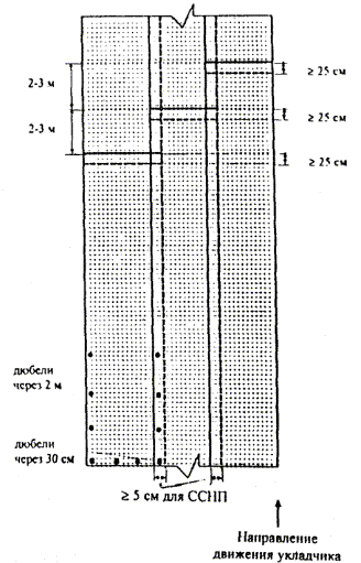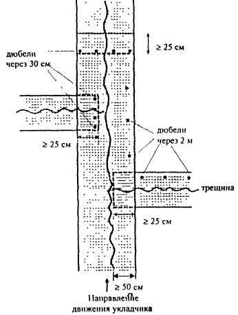 Период времени между первичным розливом битумной эмульсии и укладкой сетчатого полотна корректируют в зависимости от погодных условий. Признаком готовности обработанной битумной эмульсией поверхности к укладке сетчатого полотна является изменение цвета эмульсии с коричневого на черный. 4. ТЕХНОЛОГИЯ УСТРОЙСТВА ТРЕЩИНОПРЕРЫВАЮЩЕЙ ПРОСЛОЙКИ4.1. Подготовка поверхности основания дорожной одежды к устройству трещинопрерывающей прослойки включает следующие основные операции: очистку, прогрев и заливку мастикой трещин, а также выравнивание, просушивание и обеспыливание поверхности основания. Трещины при ширине раскрытия больше 5 мм очищают, прогревают и заливают мастикой в соответствии с техническим регламентом. Выравнивание поверхности следует осуществлять путем фрезерования или устройства выравнивающего слоя. Выравниванию подлежат участки, которые не удовлетворяют предельному состоянию по ровности поверхности основания. Основными показателями для оценки ровности должны служить размер и число просветов (в миллиметрах) под трехметровой рейкой. Запредельным состоянием по ровности следует считать наличие даже одного просвета более 14 мм или более 12 % просветов размером от 5 до 14 мм. Обеспыливание должно проводиться механической щеткой или сжатым воздухом. Влажную поверхность допускается обрабатывать специальным составом на основе олигомеров с отвердителем и пластификатором в соответствии с ВСН 24-88 (п. 8.2.15). 4.2. Первичный розлив битумной эмульсии необходимо осуществлять из расчета 0,6 л/м2. Отсутствие характерного блеска обработанной поверхности указывает на повышенную шероховатость основания; расход битумной эмульсии следует увеличить до 0,7 л/м2. После розлива битумной эмульсии устраивают технологический перерыв (см. п. 3.4). 4.3. Полотно сетки должно быть расположено следующим образом: q при лекальном армировании известной трещины - вдоль и симметрично средней линии трещины (рис. 1). Расстояние от края сетки до трещины должно быть не меньше 40 см. Для обеспечения этого условия при армировании трещины большой кривизны полотно сетки допускается разрезать на короткие куски и укладывать с нахлестом по направлению трещины; q при сплошном армировании - параллельно оси дороги несколькими рядами (рис. 2). 4.4. При сплошном армировании трещинопрерывающую прослойку устраивают по всей ширине проезжей части дороги (Ш). С учетом ширины нахлеста (Н) и рулона (Р) необходимое количество рядов сетки (К) определяют по формуле: К=(Ш+Н)/(Р+Н), где ширина нахлеста для сетки ССНП - не менее 5 см, сетки HaTelit - не менее 15 см. Схема расположения полотен Схема расположения полотен 4.5. При укладке полотен в несколько рядов поперечные стыки должны быть смещены относительно друг друга на 2-3 м. 4.6. Нахлест полотен сетки в поперечных стыках назначают с учетом направления укладки асфальтобетонной смеси, т.е. последующее полотно должно начинаться под полотном, на котором укладывается смесь. При этом ширина нахлеста верхнего полотна на нижнее должна быть не менее 25 см. 4.7. При укладке сетки начало рулона крепят к поверхности с помощью дюбелей со стальными шайбами. При ширине сетки 1 м забивают 4 дюбеля, при большей ширине дюбели забивают с шагом 30-50 см. Затем рулон сетки раскатывают на 2-3 м, вручную натягивают и укладывают на поверхность без волн и складок; боковые сто