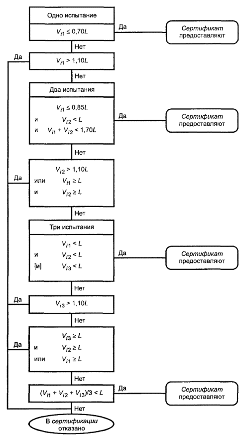 Рисунок 1 - Схема проведения сертификационных испытаний типа I 5.3.1.5.1 Проводят только одно испытание, если полученное значение по каждому вредному веществу или по общему выбросу двух вредных веществ, на которые распространяется ограничение, меньше или равно 0,70 L (V1 £ 0,70 L), где L - предельное значение содержания вредного вещества в отработавших газах. 5.3.1.5.2 Два испытания проводят, если не удовлетворяются условия 5.3.1.5.1 и если для каждого вредного вещества или общего выброса двух вредных веществ, на которые распространяется ограничение, соблюдаются следующие условия: V1 £ 0,85 L и V1 + V2 £ 1,70 L и V2 £ L. Таблица 2 - Предельные значения вредных веществ в отработавших газах