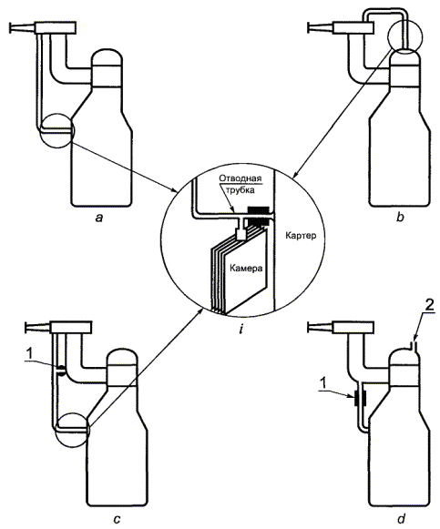 5.3.2 Испытание типа II. Определение выброса оксида углерода в режиме холостого хода 5.3.2.1 Испытание проводят на транспортных средствах максимальной массой более 3500 кг, оснащенных двигателями с принудительным зажиганием. 5.3.2.1.1 Транспортные средства, которые могут работать на бензине или СНГ, или КПГ, должны проходить испытание типа II с использованием топлива обоих видов. 5.3.2.1.2 Несмотря на требования 5.3.2.1.1, транспортные средства, которые могут работать как на бензине, так и на газообразном топливе, с системой подачи бензина только в особых случаях или для запуска двигателя, и топливным баком объемом не более 15 л (дм3) бензина проходят испытание типа II как транспортные средства, которые могут работать только на газообразном топливе. 5.3.2.2 При проведении испытания в соответствии с приложением Д содержание оксида углерода в отработавших газах двигателя, работающего в режиме холостого хода, не должно превышать 3,5 % (по объему) при регулировке, указанной изготовителем, и 4,5 % - в диапазоне регулировок в соответствии с приложением Д. 5.3.3 Испытание типа III. Определение выброса картерных газов 5.3.3.1 Испытание типа III проводят на всех транспортных средствах, указанных в разделе 1, за исключением транспортных средств, оснащенных двигателями с воспламенением от сжатия. 5.3.3.1.1 Транспортные средства, которые могут работать на бензине и СНГ или КПГ, должны проходить испытание типа III только с использованием бензина. 5.3.3.1.2 Несмотря на требования 5.3.3.1.1, транспортные средства, которые могут работать на бензине и на газообразном топливе, но в которых система подачи бензина установлена только для особых случаев или для запуска двигателя с топливным баком объемом не более 15 л бензина, должны проходить испытание типа III как транспортные средства, которые могут работать только на газообразном топливе. 5.3.3.2 В ходе проверки в условиях в соответствии с приложением Е система вентиляции картера не должна допускать выброса картерных газов в атмосферу. 5.3.4 Испытание типа IV. Определение выброса в результате испарения топлива, производимого транспортными средствами, оснащенными двигателями с принудительным зажиганием 5.3.4.1 Испытание типа IV проводят на всех транспортных средствах, указанных в разделе 1, за исключением транспортных средств, оснащенных двигателем с воспламенением от сжатия, транспортных средств, работающих на СНГ или КПГ, и транспортных средств максимальной массой более 3500 кг. 5.3.4.1.1 Транспортные средства, которые могут работать на бензине, СНГ или КПГ, подвергают испытаниям типа IV только при работе на бензине. 5.3.4.2 В ходе проверки в условиях в соответствии с приложением Ж выбросы в результате испарения должны быть менее 2 г на испытание. 5.3.5 Испытание типа V. Ресурсные испытания для проверки долговечности устройств контроля выбросов вредных веществ. 5.3.5.1 Испытание типа V проводят на всех транспортных средствах, указанных в разделе 1 и подвергаемых испытанию, указанному в 5.3.1. Это испытание, представляющее собой испытание на старение при пробеге 80000 км, проводят по программе в соответствии с приложением К на испытательном треке, дороге или динамометрическом стенде. 5.3.5.1.1 Транспортные средства, которые могут работать на бензине или СНГ, или КПГ, должны проходить испытание типа V только с использованием бензина, при этом поправочный коэффициент, опред