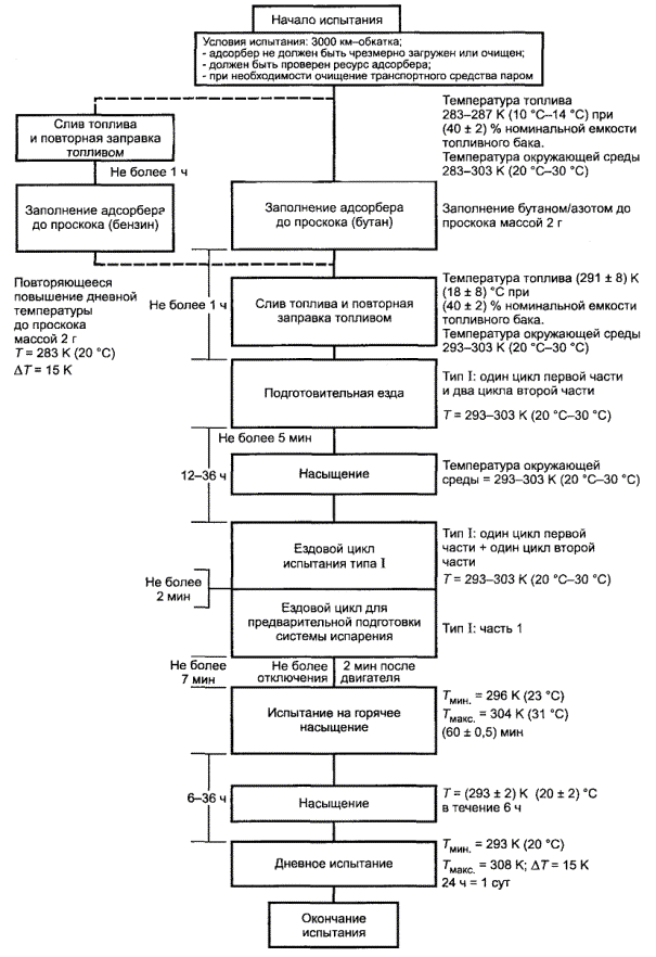 5.3 Описание испытаний 5.3.1 Испытание типа I. Определение уровня выбросов отработавших газов после запуска холодного двигателя 5.3.1.1 Схема сертификации типа транспортного средства на основании испытания типа I приведена на рисунке 1. Этому испытанию подвергают все транспортные средства, предусмотренные в разделе 1, максимальной массой не более 3500 кг. 5.3.1.2 Транспортное средство устанавливают на динамометрическом стенде, оборудованном системой имитации нагрузки и инерции. 5.3.1.2.1 Испытание проводят без перерыва в течение 19 мин. 40 с. Испытание состоит из двух частей, между которыми, по согласованию с изготовителем, может быть предусмотрен период не более 20 с, в течение которого не проводят отбор проб для облегчения регулирования испытательного оборудования. 5.3.1.2.1.1 Транспортные средства, работающие на СНГ или КПГ, подвергают испытанию типа I с вариантами в составе СНГ или КПГ в соответствии с приложением Н. Транспортные средства, которые могут работать на бензине в сочетании с СНГ или КПГ, подвергают испытаниям типа I с использованием обоих видов топлива, при этом при испытании на газе используют два варианта соответствующего газового топлива в соответствии с приложением Н. 5.3.1.2.1.2 Несмотря на требования 5.3.1.2.1.1, транспортные средства, которые могут работать как на бензине, так и на газообразном топливе, с системой подачи бензина только в аварийных ситуациях или для запуска двигателя и вместимостью топливного бака не более 15 л (дм3) бензина, подвергают испытанию типа I как транспортные средства, которые предназначены для работы только на газообразном топливе. 5.3.1.2.2 Первая часть испытания состоит из четырех простых городских циклов. Каждый простой городской цикл состоит из 15 режимов работы (холостой ход, ускорение, постоянная скорость, замедление и т.д.). 5.3.1.2.3 Вторая часть состоит из одного внегородского цикла, включающего 13 режимов работы (холостой ход, ускорение, постоянная скорость, замедление и т.д.). 5.3.1.2.4 Во время испытания отработавшие газы транспортного средства разбавляют, а пропорциональную пробу собирают в одну или несколько емкостей. Разбавление, отбор, анализ и определение общего объема разбавленных отработавших газов проводят в соответствии с описываемой ниже процедурой. Для автомобилей, оснащенных двигателями с воспламенением от сжатия, измеряют не только выбросы оксида углерода, углеводородов, оксидов азота, но и выбросы вредных частиц. 5.3.1.3 Испытание проводят в соответствии с приложением Г. Сбор и анализ газов, а также сбор и взвешивание вредных частиц следует проводить в соответствии с методами, предписанными настоящим стандартом. 5.3.1.4 В соответствии с требованиями 5.3.1.5 испытания проводят три раза. Результаты каждого испытания умножают на соответствующие коэффициенты ухудшения, определенные в 5.3.6, и, в случае систем периодической регенерации (2.20), умножают на коэффициенты регенерации каждого вредного вещества Кi, полученные в соответствии с приложением П. Результирующие массы газообразных выбросов, а для транспортных средств, оснащенных двигателями с воспламенением от сжатия, также массы вредных частиц, полученные в каждом испытании, должны быть меньше предельных значений, указанных в таблице 2 для транспортных средств соответствующих категорий. 5.3.1.4.1 Независимо от требований 5.3.1.4 для каждого вредного веще
