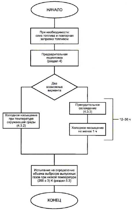 По заявке изготовителя испытательная лаборатория может провести испытание типа I до завершения испытания типа V с использованием коэффициентов ухудшения, указанных в таблице 3. После завершения испытаний типа V испытательная лаборатория может изменить результаты сертификации, указанные в приложении Б, заменой коэффициентов ухудшения, указанных в таблице 3, коэффициентами, полученными в ходе испытания типа V. 5.3.5.3 Коэффициенты ухудшения определяют в соответствии с 5.3.5.1 или по таблице 3. Коэффициенты используют для установления соответствия требованиям 5.3.1.4 и 8.2.3.1. 5.3.6 Испытание типа VI. Определение выброса оксида углерода и углеводородов с отработавшими газами после запуска холодного двигателя при низкой температуре окружающей среды 5.3.6.1 Испытание типа VI проводят на всех транспортных средствах категорий М1 и N1 класса I, оснащенных двигателями с принудительным зажиганием, за исключением транспортных средств, предназначенных для перевозки более шести человек, и транспортных средств максимальной массой более 2500 кг. 5.3.6.1.1 Транспортное средство устанавливают на динамометрическом стенде, оборудованном системой имитации нагрузки и инерции. 5.3.6.1.2 Испытание состоит из четырех простых городских ездовых циклов, предусмотренных первой частью испытания типа I. Первая часть испытания приведена в соответствии с дополнением 1 к приложению Г и представлена на рисунках Г.1 - Г.3. Испытание при низкой температуре окружающей среды проводят без остановки двигателя, начиная с его запуска в течение 780 с. 5.3.6.1.3 Для проведения испытаний при низкой температуре температура окружающей среды составляет 266 К (минус 7 °С). Перед проведением испытания транспортные средства выдерживают в единообразных условиях для обеспечения воспроизводимости результатов испытания. Предварительное кондиционирование транспортных средств и другие процедуры испытания проводят в соответствии с приложением К. 5.3.6.1.4 В ходе испытания отработавшие газы разбавляют и отбирают их пропорциональную пробу. Отработавшие газы испытуемого транспортного средства разбавляют, отбирают, анализируют и измеряют общий объем разбавленных отработавших газов в соответствии с приложением К. Анализ разбавленных отработавших газов проводят на содержание оксида углерода и углеводородов. 5.3.6.2 Испытание проводят три раза при условии соблюдения требований 5.3.6.2.2 и 5.3.6.3. Выбросы оксида углерода и углеводородов с отработавшими газами должны быть меньше значений, указанных в таблице 4. Таблица 4