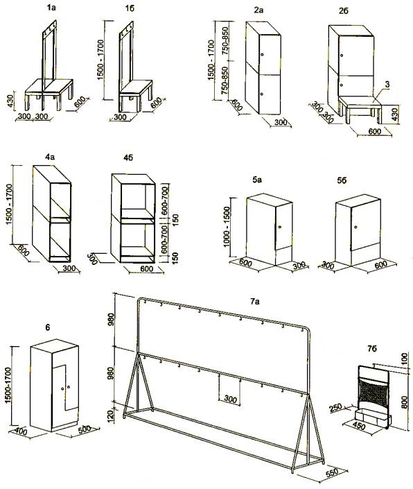 1 - скамьи для переодевания со спинкой и крючками (а - двухсторонняя, б - односторонняя);