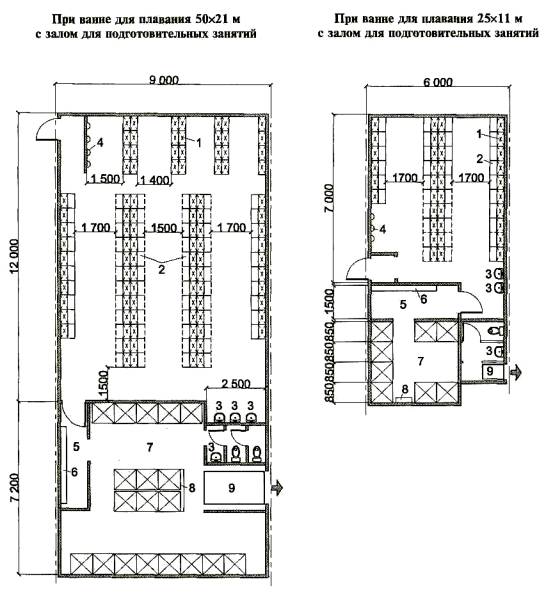 переодевания; 3 - умывальник; 4 - сушилка для волос; 5 - преддушевая; 6 -