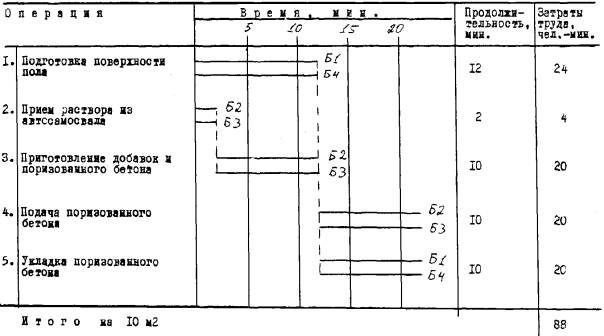 Условные обозначения. 1. Приемный бункер объемом 2,3 м3. 2. Роторное колесо для подачи раствора. 3. Вибросито. 4. Растворосмеситель СО-46А. 5. Насос для подачи раствора СО-50. 6. Емкость объемом 2 м3 для воды с электроподогревом. 7. Емкости объемом 200 л для приготовления добавок с приспособлениями для установки сверлильных машин. 8. Лебедка электрическая Т-224 для подъема приемного бункера. 9. Дополнительная емкость объемом 5 м3 для воды с электроподогревом для промывки оборудования и резиновых напорных рукавов. Рис. 1 4.4. Описание операций, их продолжительность, исполнители, орудия труда. 1. ПОДГОТОВКА ПОВЕРХНОСТИ ПОЛА. Бетонщики Б1 и Б4 очищают поверхность основания от мусора и грязи, увлажняют водой, размечают уровень заливки поризованного бетона. Операция выполняется 12 мин. 2. ПРИЕМ РАСТВОРА ИЗ АВТОСАМОСВАЛА. Бетонщики Б2 и Б3 принимают раствор в приемный бункер штукатурной станции с последующей очисткой кузова автосамосвала. Операция выполняется 2 мин. 3. ПРИГОТОВЛЕНИЕ ДОБАВОК И ПОРИЗОВАННОГО БЕТОНА. Бетонщики Б2 и Б3 в емкостях (№ 7 рис. 1) при помощи сверлильных машин приготовляют добавки (дозировку составляющих добавок см. таблицы № 2, 3, 4). Затем вводят добавки в просеянный цементный раствор (дозировку добавок см. таблица № 5) и перемешивают в течение 2 - 3 минут. Операции выполняется 10 мин. 4. ПОДАЧА ПОРИЗОВАННОГО БЕТОНА. Бетонщик Б2 включает насос и следит за его работой. Бетонщик Б3, находясь в зоне видимости бетонщиков Б2 и Б4, следит за подачей бетона. Операция выполняется 10 мин. 5. УКЛАДКА ПОРИЗОВАННОГО БЕТОНА. Бетонщик Б1 равномерно распределяет поризованный бетон по поверхности основания в соответствии с размеченным уровнем заливки бетона. Бетонщик Б4 переносит шланги и заглаживает поверхность уложенного бетона. Операция выполняется 10 мин. Норма времени Нвр. на устройство 10 м2 монолитной теплоизоляционной подготовки из поризованного бетона