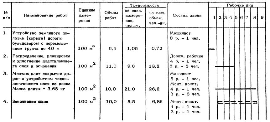 КАРТА Арх. № 8455 МОСКВА - 1983 Технологическая карта разработана проектно-технологическим отделом треста Мосоргстрой (А.Н. Абрамович, А.П. Смирнов), согласована с Управлением подготовки производства Главмосстроя и НИИМосстроем. Технологическая карта рекомендована к внедрению в строительном производстве. СОДЕРЖАНИЕ 1. ОБЛАСТЬ ПРИМЕНЕНИЯ1.1. Технологическая карта (ТК) составлена на производство работ по устройству внутриквартальных дорог (временных и постоянных) из сборных железобетонных плит на объектах Главмосстроя. 1.2. В состав работ, рассматриваемых картой, входит: устройство земляного полотна; распределение, планировка и уплотнение подстилающего слоя и основания; распределение технологического слоя; монтаж дорожного покрытия; вибропосадка плит; заполнение швов. 1.3. Технологическая карта предназначена для составления проектов производства работ (ППР) и с целью ознакомления рабочих и инженерно-технических работников с правилами производства и организацией труда. 1.4. При привязке технологической карты к конкретному объекту и условиям строительства уточняются схемы производства работ, объемы работ, калькуляция затрат труда, средства механизации. 2. ОРГАНИЗАЦИЯ И ТЕХНОЛОГИЯ СТРОИТЕЛЬНОГО ПРОЦЕССА2.1. Настоящая технологическая карта предусматривает строительство в летний и зимний периоды в г. Москве сборных покрытий временных и постоянных дорог и проездов. При строительстве полносборных покрытий применяют конструктивные элементы, приведенные в таб. 1. Плиты железобетонные с обычным армированием и предварительно-напряженные