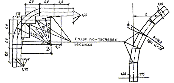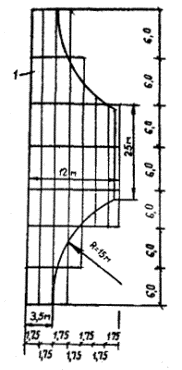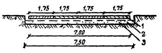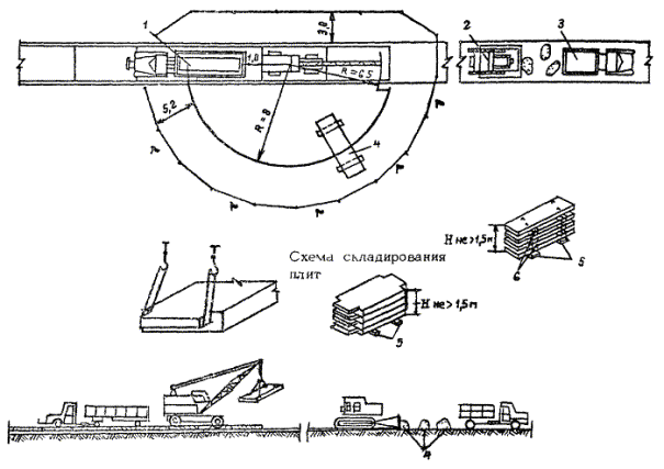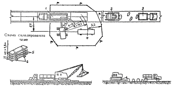 Лист 1СХЕМЫ ПРОФИЛЕЙ ДОРОГ И ПОВОРОТОВПоперечные профили дорог (проездов) с покрытием из сборных железобетонных плит, ПДП 6,0´1,75 бп и ПДП 6,0´1,75 Однополосное движение Двухполосное движение Повороты временных внутриквартальных дорог из плит ПДП 6,0´1,75 Условные обозначения: 1 - плиты дорожные железобетонные для покрытий дорог (проездов); 2 - технологический слой; 3 - подстилающий слой ПРИМЕЧАНИЕ. На стройплощадках при организации складов строительных деталей дороги однополосного движения могут выполняться шириной 5,25 м. ДОРОЖНОЕ КОРЫТО И ОСНОВАНИЕ ПОД ПЛИТЫ ВЫПОЛНЯЮТСЯ СОГЛАСНО ВСН-90-74, ВСН-143-77, ВСН-50-79, ВСН-54-80 Лист 2СХЕМЫ СТРОПОВКИ ПЛИТ ПДП 6,0´1,75 БПУсловные обозначения: а - чалки длиной 10,5 м; б - чалки минимальной длины 4,4 м и двухветвевого стропа; в - чалки минимальной длины 4,4 м и траверсы грузоподъемностью 4 тс Лист 3ТЕХНОЛОГИЧЕСКАЯ СХЕМА УСТРОЙСТВА ДОРОГИ (ПРОЕЗДА) ИЗ СБОРНЫХ ЖЕЛЕЗОБЕТОННЫХ ПЛИТ ПДП 6,0´1,75Условные обозначения: 1 - автомобиль ЗИЛ-130-В1 с полуприцепом У-30; 2 - бульдозер; 3 - автосамосвал; 4 - штабель плит; 5 - прокладки из бруса 8´8 см; 6 - подкладки из досок 15´4 см На данном листе показан вариант укладки дорожных плит гусеничным краном Э-10011Д. Кран перемещается вдоль дорожной полосы, а автомобиль с погруженными на него плитами - по уложенным плитам. Разгрузка с автомобилей и укладка дорожных плит гусеничным краном производится с грунта, рядом с дорожной полосой. Основание дороги, по которой перемещается кран, должно выдерживать нагрузки, создаваемые краном. При слабом основании кран, перемещаясь, укладывает перед собой дорожные плиты, снимая их за собой. Лист 4ТЕХНОЛОГИЧЕСКАЯ СХЕМА УСТРОЙСТВА ДВУХПОЛОСНОЙ ДОРОГИ ИЗ СБОРНЫХ ЖЕЛЕЗОБЕТОННЫХ ПЛИТ ПДП 6,0´1,75 (С ПЕТЛЯМИ)СХЕМА СКЛАДИРОВАНИЯ ПЛИТ Условные обозначения: 1 - подкладки из досок 15´4 см; 2 - прокладки из бруса 8´8 см;