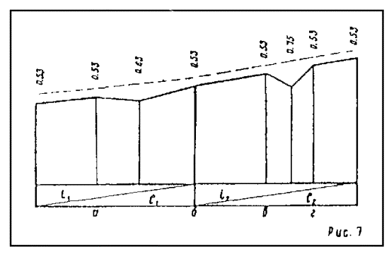где «в» - ширина существующего используемого покрытия. Для четвертого случая рабочая отметка определяется по этой же формуле, но hсущ. принимается для той половины, по которой получается большая рабочая отметка. В тех случаях, когда существующее покрытие имеет несколько изломов в поперечном профиле - рабочая отметка определяется по критической точке поперечника (рис. 5). Рис. 5 § 133. При проектировании продольного профиля реконструируемой дороги черные и красные отметки относятся соответственно к оси существующего и проектируемого покрытия. § 134. Подсчитанные, как указано выше, рабочие отметки при исправлении профиля черных покрытий и мостовых являются окончательными. В случае реконструкции белого шоссе или гравийного покрытия, когда исправление профиля производится сплошной кирковкой, подсчитанные по поперечникам отметки фактически могут измениться за счет возможного перемещения материала существующего покрытия, но проектирование продольного профиля и поперечников, а также подсчет работ и в этих случаях производятся по установленным отметкам. По рабочим отметкам, перенесенным на продольный профиль подсчитываются красные отметки, по которым определяются уклоны красной линии. Уклоны красной линии, при этом, подсчитываются с точностью до 0,1 ‰, так как в данном случае соблюдение условия о кратности продольного уклона 1 ‰ - приведет к излишнему расходу материала на выравнивание. § 135. При исправлении очертаний существующих покрытий необходимо учесть также материал на исправление отдельных неровностей продольного профиля (на подходах к существующим искусственным сооружениям, сопряжениях встречных уклонов, частых мелких изломах продольного профиля и т.п.). Эти неровности должны быть зафиксированы нивелировочными плюсами. Рабочие отметки в каждой промежуточной точке определяются по проектируемому уклону между переломными точками. Разница между определенной по проектному уклону рабочей отметкой и отметкой, фактически определенной по поперечному профилю, дает величину слоя на продольное выравнивание (рис. 6). Пример: Рис. 6 В точках: а, с, е - рабочие отметки h1, h2, h3 определены из условия выравнивания поперечного профиля (см. § 132). В точках b, d рабочие отметки h4, h5 обусловлены необходимостью выравнивания продольного профиля. Подсчет материалов для выравнивания продольного микропрофиля производится графически на стадии рабочего проектирования. Для двухстадийного проектного задания и технического проекта подсчет производится аналитически, с распространением средней величины выведенной рабочей отметки на участок протяжением не менее 0,5 км. для дорог I категории - 300 м -"- II -"- - 250 м " III " - 200 м " IV " - 150 м " V " - 100 м С целью уменьшения расхода материалов на выравнивание продольного профиля допускается уменьшение шага проектирования: до 200 м для дорог I категории до 100 м -"- II и III категорий до 50 м -"- IV и V категорий Окончательно установленные при проектировании продольного профиля отметки переносятся на поперечники и по ним производится подсчет материалов на выравнивание. При больших расходах материалов на выравнивание может оказаться более выгодным перестроить существующее покрытие, чем его выравнивать. Такие случаи чаще встречаются при реконструкции булыжных мостовых. Во всех сомнительных случаях варианты должны быть сопост