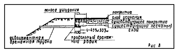 Рис. 7 § 152. Для ликвидации неровностей продольного или поперечного профиля, не выявленных при нивелировке (неровности микропрофиля) должен быть учтен дополнительный расход песка (при надстройке поверх существующих черных покрытий), выявляемый в процессе строительства (при детальной разбивке). В проекте этот расход принимается, ориентировочно, в объеме 20 - 30 куб. м на 1000 кв. м, т.е. слоем в среднем 2 - 3 см. В тех случаях, когда ширина существующего покрытия менее проектируемой, учитывается материал на устройство уширения (см. ниже §§ 158 - 165). § 153. Выбор между «надстройкой» и «перестройкой» должен быть обоснован технико-экономическими подсчетами, с учётом условий производства работ и целесообразности использования каменных материалов существующего покрытия. В частности, могут быть случаи, когда существующую булыжную мостовую целесообразно использовать в качестве основания под уменьшенный подстилающий слой песка, если стоимость песка высокая (песок дальнепривозной). Наоборот, если имеется песок местный с небольшой дальностью возки, целесообразно булыжную мостовую разобрать и использовать камень для укрепительных работ (если местного камня нет). При частых переломах продольного профиля существующей дороги применять «надстройку» становится невыгодным, т.к. значительно увеличивается дополнительный расход песка на выравнивание профиля и трудно достичь необходимой плавности его. Однако, при близком расположении карьеров песка не следует и в этом случае отказываться от надстройки. § 154. В тех случаях, когда вариант непосредственной «надстройки» не обеспечивает необходимого возвышения земполотна, а дорожная одежда ценности не представляет (что часто встречается на пучинистых участках) - применяется вариант «захоронения», при котором существующая дорожная одежда не разбирается, а засыпается слоем грунта. § 155. При наличии отдельных пучинистых участков небольшого протяжения (до 100 м) и нецелесообразности устройства «надстройки» по условиям сопряжения продольного профиля смежных участков, применяется перестройка с разборкой существующей дорожной одежды. Если при этом производится замена грунта, то обязательно устраиваются поперечные дренажи. § 156. Конструкция земляного полотна на участках перестройки должна быть принята в соответствии с требованиями НиТУ-128-55. При проектировании могут встретиться следующие случаи: а) сооружение дорожного полотна в насыпях, отвечающих требованиям НиТУ в отношении возвышения бровки над поверхностью земли и горизонтом грунтовых вод. При этом должны быть изучены возможности сооружения насыпей из местных или привозных пригодных грунтов, учитывая, что применение последних позволит уменьшить объем земляных работ, уменьшить толщину одежды и одновременно повысить надежность работы дороги. На участках реконструируемой дороги, где сооружаются новое земляное полотно и дорожная одежда, конструирование и расчет ведутся так же, как при новом строительстве. б) На тех участках, где сооружение земляного полотна достаточного возвышения (высоты) по тем или иным причинам оказывается невозможным (в выемках, в населенных пунктах и в других случаях) производится замена грунта. При этом мощность слоя, не утрачивающего несущую способность при увлажнении, должна быть не менее 1,2 - 0,8 м во II - III климатических