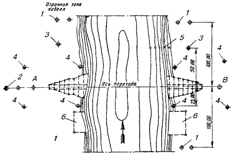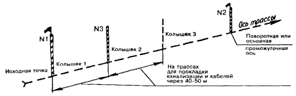 РАЗБИВКА ТРАСС2.18. Разбивка трассы состоит из двух рабочих операций: а) переноса с рабочего чертежа в натуру и закрепления поворотных и основных промежуточных центров оси трассы, которые должны даваться в абсолютных привязках от местных ориентиров и от «красной линии» застройки. Разбивка должна производиться с помощью геодезического инструмента, при привязке к местным ориентирам - с помощью мерной цепи или рулетки; б) определения прямолинейности и переноса в натуру продольной оси трассы между поворотными и основными промежуточными центрами с помощью вешек, мерной цепи или рулетки. 2.19. Закрепление прямолинейности трасс, а также мест контрольных точек при прокладке подземных сооружений с помощью вех должно выполняться следующим образом. Главную веху № 1 высотой 3 - 4 м с красным флажком устанавливают в исходной точке, а вторую такую же веху № 2 устанавливают в следующей точке (в поворотном или основном промежуточном центре) так, чтобы ее было видно со стороны первой вехи. Затем между первой и второй вехами устанавливают веху № 3 таким образом, чтобы она находилась в створе (на одной прямой) с первой и второй вехами. Третью и последующие вехи устанавливают со стороны первой через каждые 40 - 50 м. Правильность установки третьей вехи проверяют глазомерной визировкой с первой на вторую веху. Если третья веха находится на прямой, соединяющей первую и вторую вехи, она закрывает собой для наблюдателя со стороны первой вехи вторую веху и наоборот. Места установки фиксируют кольями (рис. 2.1). Рис. 2.1. Установка вех Колья, применяемые для разбивки трасс, должны иметь длину 30 - 40 см и диаметр 3 - 4 см. Нижнюю часть кола затесывают на конце, а на верхней делают срез для маркировки. Для забивки кола заготавливают гнездо с помощью лома. 2.20. При ручной разработке траншеи на расстоянии, равном половине ее ширины от колышков, следует натягивать шнур, обозначающий линию одного из краев траншеи. 2.21. В том случае, когда при разбивке обнаружатся несоответствие рабочих чертежей натуре и необходимость выполнения работ с отклонением от проектных данных, строительная организация должна пригласить представителей заказчика и проектной организации для решения вопроса об изменении трассы, что оформляется актом или коррекцией рабочего чертежа, которая должна быть удостоверена подписями представителей заказчика, проектной и заинтересованной организаций. 2.22. В процессе разбивки трасс ГТС необходимо учитывать следующее: а) пересечение улиц подземными сооружениями ГТС должно осуществляться под углом 90° к оси улицы, только при невозможности этого допускается отклонение от прямого угла в пределах не более 45°; б) пересечение рельсовых путей (железнодорожных и трамвайных) подземными сооружениями ГТС должно осуществляться только под углом 90°; в) в садах, парках и скверах разбивка трасс должна производиться в присутствии представителя садово-паркового хозяйства и зеленого строительства с учетом наименьших повреждений зеленых насаждений. 2.23. При разбивке трассы прокладки кабельной канализации и кабелей связи в грунте необходимо соблюдать минимальные расстояния между ними и другими сооружениями, приведенные в табл. 2.2. Таблица 2.2