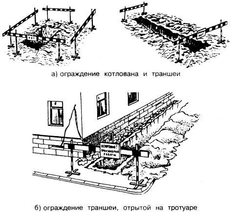 1) При защите кабеля в кювете кирпичом, бетонными плитами и т.п. это расстояние может быть уменьшено до 0,5 м. 2) В числителе указаны расстояния при прокладке кабелей непосредственно в грунте, в знаменателе - в трубах, а при отсутствии дроби - для обоих случаев. 3) При сближении низкочастотных кабелей связи с силовыми кабелями напряжением до 10 кВ допускается 0,25 м при условии защиты кабелей (прокладка в трубах, установка несгораемых перегородок и т.п.). 4) При пересечении с силовыми кабелями напряжением до 35 кВ в стесненных условиях допускается 0,15 м при условии разделения кабелей на всем участке пересечения плюс 1 м в каждую сторону плитами или трубами из бетона или другого равнопрочного материала; при этом кабель связи должен быть расположен выше силового кабеля. 5) При прокладке кабеля в стальной трубе или покрытии его швеллером по длине, равной расстоянию между крайними проводами ВЛ плюс 15 м с каждой стороны от крайних проводов, допускается уменьшение этих расстояний до 10 м. 6) При прокладке кабеля в стальной трубе или покрытии его швеллером по длине, равной расстоянию между крайними проводами ВЛ плюс 10 м с каждой стороны от крайних проводов, допускается уменьшение этих расстояний до 5 м. 7) Данные расстояния могут быть уменьшены соответственно до 2 и 5 м при прокладке кабеля в стальной трубе или покрытии его швеллером или угловой сталью по длине в обе стороны относительно опоры не менее 3 м в населенной местности и 9 м - в ненаселенной местности. 8) При этом кабель должен быть проложен в стальной трубе или покрыт швеллером или угловой сталью по длине в обе стороны от опоры не менее 3 м. 9) Норма дана для кабелей ЛС и кабельной канализации. 10) При пересечении кабеля ПВ с кабелями ЛС и ПВ это расстояние должно быть не менее 0,5 м; при этом прокладываемый кабель ПВ на всем участке пересечения плюс 1 м с каждой стороны от него должен быть заключен в трубу. Примечание. Кабели и кабельная канализация прокладываются: - выше канализационных и водопроводных сетей; - выше или ниже действующих кабелей связи, силовых кабелей, газопроводов, нефтепроводов и теплосетей. ОГРАЖДЕНИЕ УЧАСТКОВ ПРОИЗВОДСТВА ЗЕМЛЯНЫХ РАБОТ2.24. Участки производства земляных работ в городских условиях должны ограждаться рогатками на переносных стойках (рис. 2.2, а и 2.2, б), а при производственной необходимости или по требованию территориальной администрации - инвентарными щитами (рис. 2.3аи 2.3.б) или глухим забором. На ограждении должны быть указаны: наименование строительной организации, фамилия и номер телефона производителя работ. Рис. 2.2. Ограждение траншей и котлованов рогатками на переносных стойках