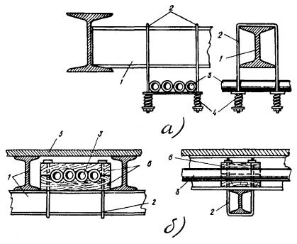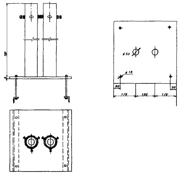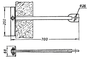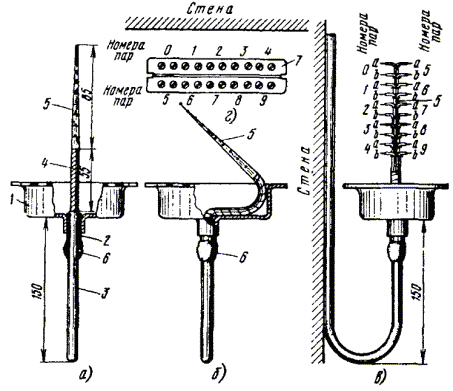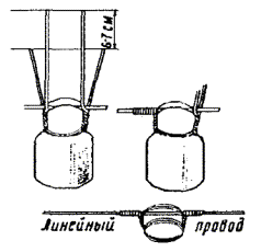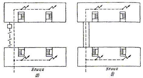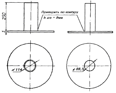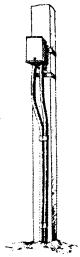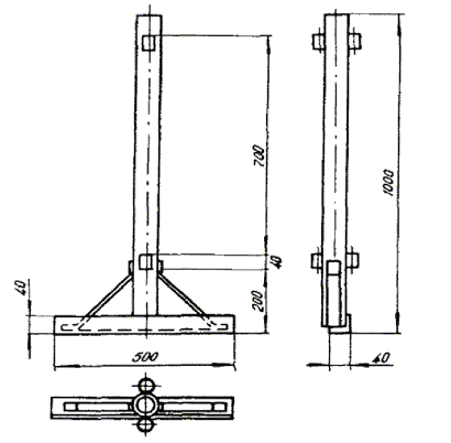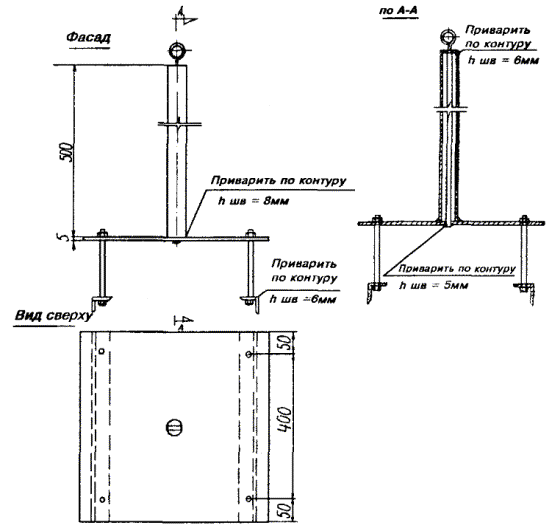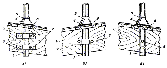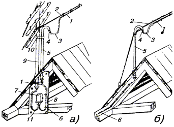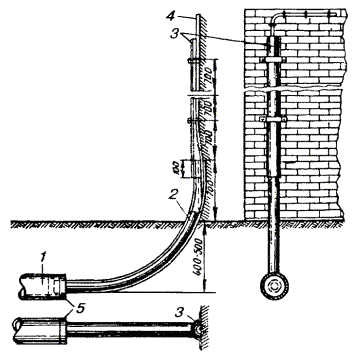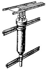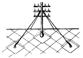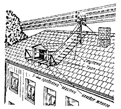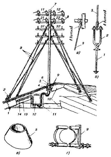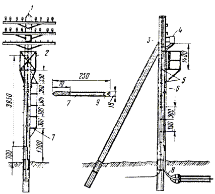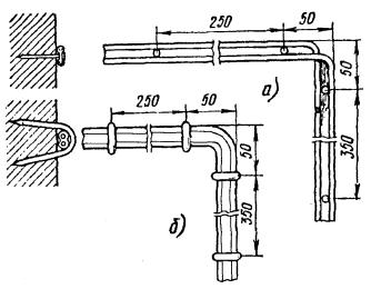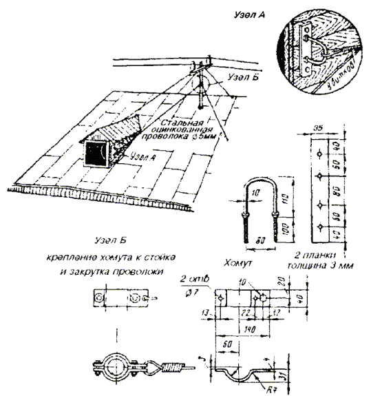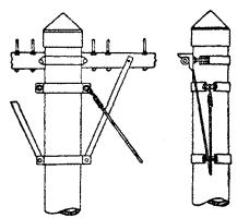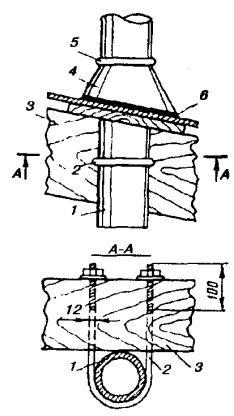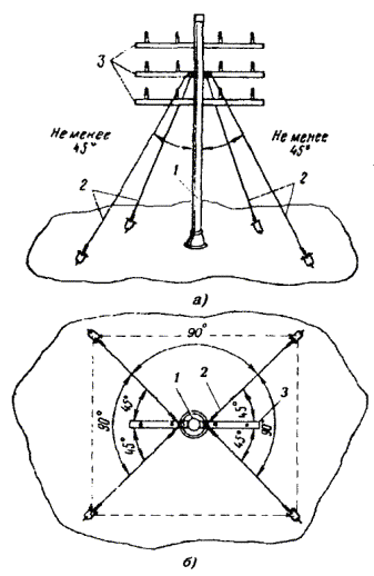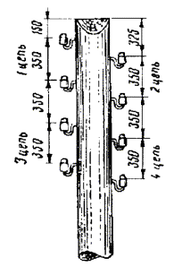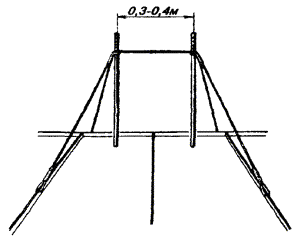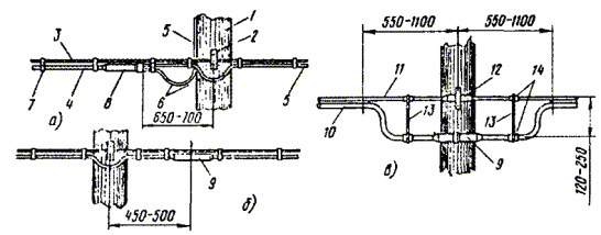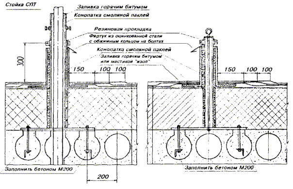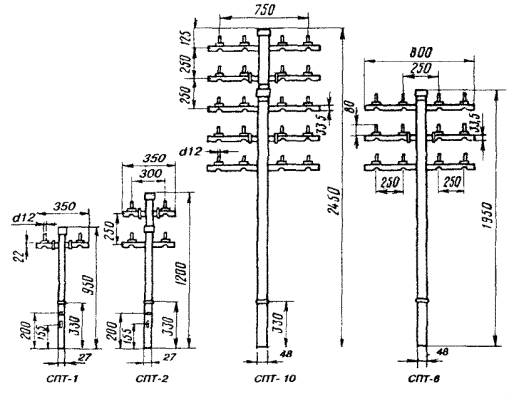 Примечания: 1. В негололедных районах кабель массой до 1100 кг/км, а в слабогололедных районах массой до 750 кг/км допускается подвешивать на оцинкованной стальной проволоке диаметром 5 мм (за исключением пролетов на переходах). 2. Стрела провеса кабелей ТППт (с встроенным тросом) регулируется по нормам последней строки таблицы. РАЗДЕЛ 9СТРОИТЕЛЬСТВО СТОЕЧНЫХ ЛИНИЙУСТРОЙСТВО СТОЕЧНЫХ ЛИНИЙ9.1. Стоечные линии состоят из установленных на крышах зданий металлических опор-стоек, на которые подвешены провода или распределительные кабели. 9.2. Опоры-стойки изготовляют четырех типов СПТ-1, СПТ-2, СПТ-6 и СПТ-10 для подвески соответственно одной, двух, шести и десяти пар проводов (рис. 9.1). Рис. 9.1. Стоечные опоры Основным материалом для изготовления стоек служат трубы стальные диаметром 48 и 27 мм. 9.3. По месту установки стойки подразделяются на промежуточные, оконечные и кабельные. Для перехода с чердака на крышу или обратно применяют выводные трубы, укрепляемые самостоятельно или к стойкам с помощью двойного хомута (рис. 9.2). На трассах с подвеской только кабелей в качестве промежуточных и оконечных опор применяют, как правило, выводные трубы. В качестве кабельных опор, устанавливаемых в месте соединения проводов с жилами кабеля (через кабельный ящик), следует применять стойки СПТ-10 или СПТ-6. Рис. 9.2. Установка выводной трубы: а - у стойки; б- самостоятельно; в - хомут Как промежуточные опоры для подвески одной пары проводов (при отсутствии перспективы подвески второй пары проводов) могут применяться штыри из круглой стали диаметром 12 мм и длиной 700 мм, установленные на крыше и для устойчивости связанные между собой стальной оцинкованной проволокой диаметром 2 мм и укрепленные оттяжками (рис. 9.3). Рис. 9.3. Установка пары штырей 9.4. В комплект арматуры стоек входят следующие детали: колпачок, опорное кольцо, копыто, подкопытник, ступеньки струбцины, болты с гайками и шайбами, чугунные хомуты и болты для их крепления, стальные хомуты. На стоечных линиях следует применять стальные и биметаллические (сталемедные) провода диаметром 1,2 - 2,0 мм. При пересечении проводов проводного вещания или высокого напряжения необходимо подвешивать изолированные провода. Для подвески и закрепления проводов применяют изоляторы Тф-12. Порядок оснастки штырей изоляторами приведен в разделе 8. Количество изоляторов, которыми оснащаются траверсы стоек, определяется числом фактически подвешиваемых проводов. УСТАНОВКА И УКРЕПЛЕНИЕ СТОЕЧНЫХ ОПОР9.5. При разбивке трассы и выборе мест установки стоек необходимо уточнить проектные решения с соблюдением следующих требований: а) трасса стоечной линии должна быть, по возможности, прямолинейной и иметь минимальное количество пересечений с другими линиями, особенно с линиями электропередачи; б) длина пролета стоечной линии, как правило, не должна превышать 80 м. При невозможности выполнения этого, в виде исключения допускается увеличение пролета до 100 м; в) опоры стоечной линии следует размещать на зданиях примерно одинаковой высоты для уменьшения резких перегибов подвешиваемых проводов или кабелей в вертикальной плоскости; г) опоры следует устанавливать как можно ближе к гребню крыши для обеспечения возможно большего расстояния от подвешиваемых проводов или кабелей до поверхности крыши и вершин деревьев; д) трасса подвески проводо