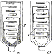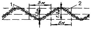 Примечания: 1. Ширина траншей по низу должна быть на 0,1 м меньше ширины траншей по верху. 2. Ширина траншей в скальных и мерзлых грунтах при предварительном рыхлении взрывным способом определяется принятой технологией буро-взрывных работ. 2.40. На склонах оврагов, крутых подъемах и спусках свыше 30° и до 45° траншея должна быть вырыта зигзагообразно («змейкой»), с максимальным отклонением от осевой прямой линии 1,5 м на длине 5 м (рис. 2.6). При уклонах от 30° до 45° прокладывается кабель с обычной броней (например, КСППБ), а при уклонах свыше 45° - с проволочной броней (КСППК). Рис. 2.6. Зигзагообразная траншея при уклоне 30 - 45°: 1 - траншея; 2 - кабель РАЗРАБОТКА ТРАНШЕЙ И КОТЛОВАНОВ В МЕРЗЛЫХ ГРУНТАХ2.41. В мерзлых грунтах при толщине мерзлого слоя до 0,25 м допускается разработка траншей одноковшовыми экскаваторами с ковшом емкостью до 0,5 м3 без предварительного рыхления. При глубине промерзания грунта более, чем на 0,25 м необходимо производить предварительное рыхление грунта на всю глубину промерзания с удалением разрыхленного грунта одноковшовым экскаватором, либо разрабатывать траншеи на полную глубину роторными экскаваторами в соответствии с их техническими характеристиками. Рекомендуется применение роторного экскаватора типа ЭТР-134, баровой машины типа ДГП-ЗУМ или цепного траншейного экскаватора типа ЭТЦ-208Д. 2.42. При разработке вручную траншей и котлованов в мерзлом грунте, осуществляемой, как правило, для строительства кабельной канализации в городских районах с большим количеством подземных коммуникаций, применяется предварительный отогрев грунта. В табл. 2.5 приведены способы оттаивания грунта. 2.43. На практике применяется оттаивание мерзлых грунтов сжиганием под металлическими коробами дровяного топлива. Применение в качестве топлива угля и нефтепродуктов практически невозможно из-за сильного загрязнения окружающего воздуха. Наиболее приемлемым представляется осуществление отогрева грунта с помощью газовых горелок инфракрасного излучения. Этот метод требует соответствующего технического оснащения и внедрения в строительное производство. 2.44. При прогреве грунта в населенных пунктах, где имеются подземные сооружения, должны соблюдаться правила техники безопасности и обеспечиваться сохранность этих сооружений. Таблица 2.5 Технико-экономические показатели различных способов оттаивания грунта