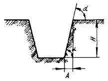 КРЕПЛЕНИЕ СТЕН ТРАНШЕЙ И КОТЛОВАНОВ2.45. Разработка траншей и котлованов с вертикальными стенками в грунтах естественной влажности без крепления может производиться на глубине: не более 1 м - в насыпных, песчаных и гравелистых грунтах; не более 1,25 м - в супесчаных и суглинистах грунтах; не более 1,5 м - в глинистых грунтах; не более 2 м - в особо плотных грунтах. При этом выполнение работ следует производить немедленно вслед за отрывкой траншей и котлованов. 2.46. При превышении указанных глубин рытье траншей и котлованов допускается только при условии крепления вертикальных стен или устройстве откосов допустимой крутизны (рис. 2.7). Наибольшая допустимая крутизна откосов траншей и котлованов в грунтах естественной влажности должна определяться по табл. 2.6. Рис. 2.7. Определение крутизны откоса 2.47. Рытье траншей и котлованов в мерзлых грунтах всех пород, за исключением сухого песчаного, можно вести с вертикальными стенками без креплений на всю глубину их промерзания. При углублении ниже уровня промерзания должно производиться крепление. 2.48. Траншеи и котлованы в сухих (сыпучих) песчаных грунтах, независимо от степени их промерзания, следует разрабатывать с обеспечением установленной крутизны откосов или с устройством крепления стен. 2.49. Рыть траншеи и котлованы в отогретых (размороженных) грунтах следует выполнять с обеспечением необходимой крутизны откосов или устройством креплений стен в тех случаях (или местах), когда глубина отогретого участка превышает размеры, указанные в табл. 2.6. Таблица 2.6 Максимально допустимая крутизна откосов траншей и котлованов