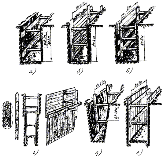 1) угол между направлением откоса и горизонталью 2) отношение высоты откоса Н к его заложению А Примечание. При глубине выемки свыше 5 м крутизна откоса устанавливается расчетным путем. 2.50. На пересечениях с железнодорожными или трамвайными путями необходимо разрабатывать траншеи и котлованы с обязательным креплением их стен. Крепить пути рельсовыми пакетами следует только в случаях, предусмотренных проектом, согласованным со службой эксплуатации данных путей. 2.51. Виды крепления котлованов и траншей с вертикальными стенками приведены в табл. 2.7. Таблица 2.7 Виды крепления котлованов и траншей с вертикальными стенками