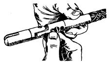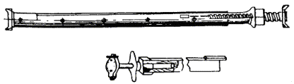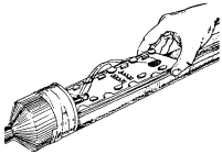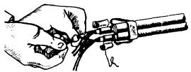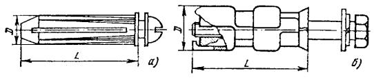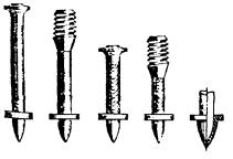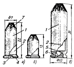 Рис. 7.26. Монтажный пистолет Применение строительно-монтажного пистолета в особенности целесообразно при креплении деталей к высокопрочным строительным основаниям из бетона, железобетона и металла, сверление гнезд в которых весьма трудоемко. Пистолет обладает большой маневренностью, так как его работа не зависит от источников энергии. 7.57. При работе с пистолетом следует руководствоваться требованиями «Руководящего технического материала «Инструмент пороховой. Типы, технические данные, область применения, хранение и ремонт» РТМ 36.6-87», ММСС СССР, «Руководства по применению строительно-монтажного пистолета ПЦ-84 (ПЦ 52-1) при строительстве объектов связи», ССКТБ, М, 1990 и Паспорта пистолета ПЦ 84.000.000 ПС. 7.58. Крепление деталей с помощью пистолета производится дюбелями-гвоздями марки ДГ и дюбелями-винтами марки ДВ (рис. 7.27). Несъемное крепление должно осуществляться при помощи дюбелей-гвоздей, съемное - при помощи дюбелей-винтов, на резьбу которых навертываются гайки. 7.59. В пистолетах ПЦ-84 (ПЦ 52-1) применяются специальные беспульные патроны групп: Д (длинные), К (короткие) и МПУ (усиленные) (рис. 7.28). Рис. 7.27. Дюбели для монтажного пистолета Рис. 7.28. Монтажные патроны: а) патрон Д; б) патрон К; в) патрон МПУ 1 - гильза; 2 - пороховой заряд; 3 - пыж; 4 - ударный состав; 5 - запальные отверстия; 6 - капсюль; 7 - место окраски патрона 7.60. Работа с пистолетом ПЦ-84 должна выполняться рабочим, прошедшим специальное обучение и имеющим удостоверение. Рабочие, применяющие пистолет, должны иметь и пользоваться индивидуальными средствами защиты: каской, защитным щитком или предохранительными очками, противошумными наушниками группы А и перчатками. 7.61. При пристрелке деталей крепления необходимо выполнять следующие требования: а) ширина пристреливаемой детали крепления должна быть не менее 20 мм; б) наименьшая толщина строительного бетонного или железобетонного основания в месте забивания дюбеля должна быть равна 80 мм; в) расстояние от точки забивания дюбеля до ближайшего края строительного основания должно быть не менее 100 мм - для бетонного, железобетонного и кирпичного оснований; г) при креплении на неоштукатуренной кирпичной поверхности дюбель следует забивать в горизонтальный шов кирпичной кладки; д) наименьшее расстояние между соседними дюбелями, забиваемыми в строительное основание, должно быть 50 мм для бетонного и железобетонного оснований; е) при пристрелке к бетонному и кирпичному основанию стальной детали толщиной 3 - 4 мм, расстояние между соседними дюбелями должно быть не менее 200 мм; ж) пристреливаемая деталь должна плотно прилегать к строительному основанию; з) после выстрела головка дюбеля-гвоздя должна плотно прижимать закрепленную деталь без разрушения и деформации детали и центрирующей шайбы. 7.62. Основные правила работы с пистолетом приводятся ниже. Для выполнения работы с пистолетом рабочий должен: а) получить от производителя работ (мастера) допуск-наряд на производство работ, получить также пистолет и патроны (не более дневной нормы); б) ознакомиться с рабочими чертежами прокладки кабелей по стенам здания, выяснить, каков материал стенового основания, осмотреть произведенную разметку мест установки деталей крепления; в) определить наличие в местах пристрелки стальной арматуры, скрытых проводок и других инженерных коммуникаций для ис