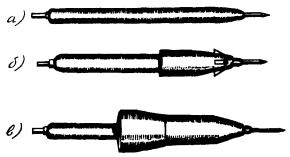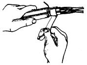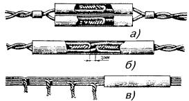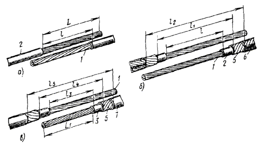 Примечания: 1. В числителе указана длина участков L и L1 для муфты с ненумерованными жилами, а в знаменателе - с нумерованными. 2. Длины L, l, l1, l2 указаны для кабелей ТГ, ТПП (рис. 11.6, а) и ТБ (рис. 11.6, б). 3. Длины L1, l3 - l5 указаны для кабелей ТППБ и ТППБШп (рис. 11.6, в). 4. На кабелях с разнонаправленной скруткой жил указанную длину разделки следует увеличить в 2 - 3 раза для обеспечения возможности качественной разборки сердечника на пары. 11.29. По размерам подобранных муфт на сращиваемых концах кабелей делаются отметки местоположения муфт и намечаются места обрезов оболочки и защитных покровов, а также участок оболочки, который должен зачищаться. Отметки обрезов наносят на оболочку и защитные покровы кабельным ножом. Обрезы оболочек выполняются таким образом, чтобы обеспечить необходимую величину их захода в корпус муфты. Величина захода оболочки в муфту в среднем 10 - 15 мм. 11.30. Длина зачищаемого участка оболочки зависит от типа кабеля и метода восстановления оболочки. Для пайки свинцовых муфт достаточно зачищенных участков оболочки длиной 60 - 80 мм. На такую же длину зачищаются полиэтиленовые оболочки или шланги в том случае, если они восстанавливаются методом наплавления полиэтиленовой ленты под стеклолентой. Если же оболочка восстанавливается с помощью трубок ТУТ, то длина зачищаемого участка увеличивается до длины применяемого отрезка ТУТ. Зачищаемый участок оболочки обезжиривается ацетоном или бензином Б-70. Особенно тщательно должны обезжириваться и зачищаться места наложения подклеивающего слоя. Зачистка оболочки выполняется кабельным ножом по всему периметру. Для зачистки металлических оболочек может применяться стальная кордная щетка, а для зачистки полиэтиленовых оболочек - абразивная шкурка или бумага. Применение абразивных материалов допускается только при использовании трубок ТУТ, так как в этом случае шероховатая поверхность в месте наложения подклеивающего слоя повышает надежность соединения, а мелкие посторонние включения при этом не влияют на его качество. 11.31. Для удаления с конца кабеля свинцовой оболочки на ней в намеченном месте делают круговой надрез, и оболочка легко стягивается с сердечника (у городских кабелей емкостью до 300´2). Для кабелей емкостью более 300´2, кроме кругового надреза, выполняют еще один или два продольных надреза, идущих от кругового надреза к концу кабеля, на расстоянии 10 - 15 мм друг от друга. При одном продольном надрезе оболочку, начиная с конца, постепенно раздвигают и снимают с сердечника. При двух продольных надрезах конец полоски между ними захватывают плоскогубцами, и полоска удаляется путем накручивания ее на плоскогубцы. Затем кромки раздвигают и оболочку снимают с сердечника. При выполнении надрезов следует соблюдать осторожность, чтобы не повредить внутренние элементы кабеля. 11.32. При разделке кабелей ТПП для облегчения выполнения надрезов оболочки ее следует предварительно прогреть пламенем газовой горелки или паяльной лампы. После удаления оболочки лента спирально наложенного экрана кабеля ТПП скручивается в рулон и подвязывается у обреза оболочки. Если экранную ленту смотать невозможно, у обреза оболочки оставляют участок экрана длиной 20 мм. Экранная лента у обреза оболочки закрепляется бандажом из голой медной проволоки. Такой же участок экрана оставляют и на кабеля