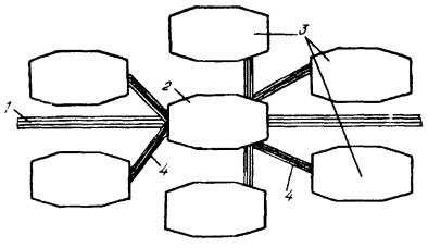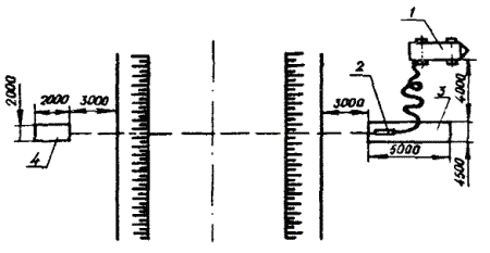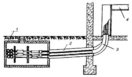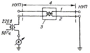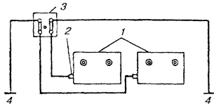 18.25. Место установки РТ определяется проектом. Если требуется установка одного РТ на участке, то его располагают примерно посередине, если двух - то по концам, при трех и более - равномерно по длине. В зависимости от конкретных условий место установки РТ в процессе строительства может быть перенесено на одну - две строительные длины кабеля в ту или другую сторону от расчетного, но в пределах одного и того же усилительного или регенерационного участка. 18.26. РТ необходимо устанавливать в земле так, чтобы вводные патрубки трансформатора находились на глубине прокладки кабеля. При этом верхняя часть контейнера должна быть на 0,25 м выше максимального уровня грунтовых вод. Если оба условия обеспечить нельзя, то трансформатор необходимо установить так, чтобы соблюдалось второе условие. Входной контроль РТ перед их установкой следует производить в соответствии с указаниями, приведенными в «Инструкции по установке и монтажу редукционных трансформаторов серии ОСГР» (VI., 1982), а также в «Руководстве по строительству линейных сооружений магистральных и внутризоновых кабельных линий связи» (М., «Радио и связь», 1986). 18.27. Для защиты корпуса РТ от коррозии применяют битумно-полимерное или битумно-минеральное покрытие в соответствии с действующим ГОСТ 9.015. Перед нанесением защитных покрытий поверхность необходимо очистить от ржавчины и промыть бензином. Если удельное сопротивление грунта меньше 20 Ом×м, следует применять дополнительную защиту в виде протектора, подключенного через щиток КИП к болту заземления РТ (рис. 18.4). В этом случае вместо замерного столбика устанавливают столбик КИП. Установку протекторов и контроль эффективности их действия осуществляют в соответствии с указаниями, изложенными в разделе 17. На кабелях с наружным защитным покровом типа Бп защищать корпус РТ от коррозии не требуется, так как он будет защищен одновременно с защитой бронепокрова. Рис. 18.4. Схема включения протектора для защиты корпуса РТ от коррозии: 1 - редукционные трансформаторы; 2 - болт заземления; 3 - щиток КИП; 4 - протекторы 18.28. Для обеспечения защитного действия РТ по концам защищаемого участка оборудуют заземляющие устройства, которые подключают к металлическим покровам кабеля через щиток КИП-2. Требуемые значения сопротивлений растеканию заземляющих устройств определяются проектом. В качестве заземляющих устройств для РТ могут быть использованы защитные заземления станций, промежуточные заземления металлических покровов кабелей при условии, что их сопротивления растеканию удовлетворяют значениям, установленным в проекте. 18.29. Подключать промежуточные заземления, а также соединять металлические оболочки с бронепокровом (на кабелях с наружным защитным покровом типа Бп) на участках, где установлены РТ, допускается только на щитке КИП-2 через разрядник Р-76. 18.30. Симметрирование кабелей производят после установки и монтажа РТ. 18.31. После монтажа РТ и проверки электрических параметров цепей на смонтированном участке проверяют сопротивление изоляции экрана или металлической оболочки кабеля по отношению к земле, а также целостность экрана или металлической оболочки на защищаемом участке с помощью прибора типа ПКП. Экран и металлическая оболочка на всем протяжении защищаемого участка должны быть непрерывны и однородны. На участках сближения к