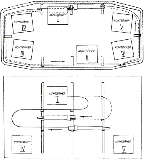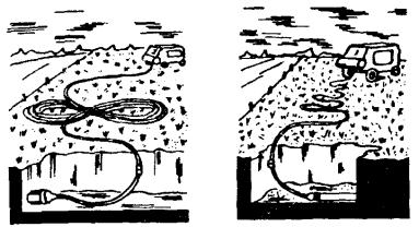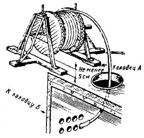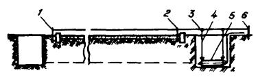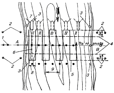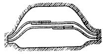а) отрывают входной и приемный котлованы. Длина входного котлована (вдоль оси скважины) должна быть 5 м, ширина - 1 м, глубина должна соответствовать проектной глубине заложения скважины, но не менее 1 м (во избежание самопроизвольного выхода пневмопробойника на поверхность). Длина приемного котлована должна быть 1,8 - 2,0 м, а ширина и глубина на 0,5 м больше, чем входного. При длине скважин более 20 м рекомендуется глубину заложения скважины принимать не менее 1,5 м. Входной и приемный котлованы должны располагаться на расстоянии не менее 3 м от нолевой бровки кювета, дороги. Дно входного котлована должно быть выравнено строго горизонтально по уровню. Расположение котлованов и механизмов показано на рис. 2.11; Рис. 2.11. Расположение входного и приемного котлованов и механизмов при устройстве скрытого перехода: 1 - компрессорная станция; 2 - пневмопробойник; 3 - входной котлован; 4 - приемный котлован б) пневмопробойник укладывают на дно котлована и ориентируют его в заданном направлении (в горизонтальной и вертикальной плоскостях) с помощью шнура, отвеса и уровня, как это показано на рис. 2.12; Рис. 2.12. Установка пневмопробойника: 1, 2, 6 - стойки; 3 - шнур; 4 - приемный котлован; 5 - пневмопробойник в) для придания пневмопробойнику при пуске нужного направления в вертикальных и горизонтальных плоскостях рекомендуется применять пусковое устройство типа ИК-9214; г) пневмопробойник подключают к компрессору с помощью предварительно продутого сжатым воздухом шланга, имеющего на конце штуцер (муфту); д) шланг укладывают на земле восьмерками или змейкой во избежание самопроизвольного вращения патрубка, как показано на рис. 2.13; е) открыв вентиль у ресивера, производят пуск пневмопробойника (при неудаче повторный пуск производят перегибанием и последующим резким распрямлением шланга). Рис. 2.13. Укладка шланга от компрессора При запуске пневмопробойника рекомендуется подавать пониженное давление 3 - 4 кгс/см2; ж) в начале углубления пневмопробойника, пока не произойдет его надежное сцепление с грунтом, необходимо прикладывать к нему усилие в направлении движения с помощью рычага (лома); з) после того, как пневмопробойник углубится в грунт на 1/2 длины корпуса, машину необходимо остановить, проверить положение пневмопробойника и в случае отклонения его при помощи лома сместить хвостовую часть пневмопробойника в нужную сторону. После этого запустить пневмопробойник и давление довести до номинального (6 кгс/см2). При прохождении слабых грунтов, если движение машины вперед прекращается (машина работает на одном месте), рекомендуется снизить давление сжатого воздуха. Во избежание самореверсирования или остановки пневмопробойника в процессе работы нужно постоянно следить за тем, чтобы шланг входил в скважину без перегибов и вращения. При выходе пневмопробойника из грунта во избежание обрушения стенки приемного котлована следует снизить давление до 3 - 4 кгс/см2; и) скважину при необходимости расширяют вторичной проходкой пневмопробойником с закреплением на его корпусе расширителя соответствующего диаметра; к) при встрече с непреодолимым препятствием или при недопустимом отклонении пневмопробойника от нужного направления он должен быть остановлен и возвращен из скважины посредством реверсирования, которое осуществляется в соответствии с заводской инструкцие