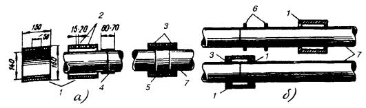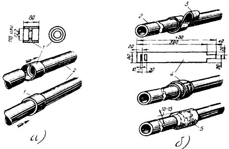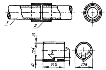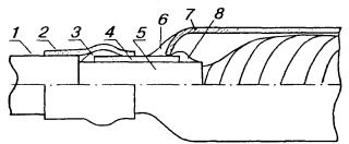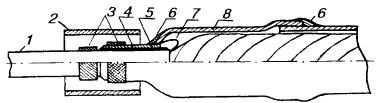 11.87. До удаления оболочки с концов сращиваемых кабелей на кабель с полиэтиленовой оболочкой надвигаются отрезки ТУТ (один или два, в зависимости от емкости кабеля), затем - части свинцовой муфты. На полиэтиленовую оболочку, начиная от места намечаемого обреза, накладывается бумажная прокладка из трех - четырех слоев кабельной бумаги, на которую устанавливается свинцовая втулка с продольным разрезом, подбиваемая киянкой до плотной посадки на оболочку и так, чтобы продольный разрез втулки сошелся встык, без зазора. 11.88. После окончания монтажа сростка жил, восстановления поясной изоляции над сростком, установки свинцовой муфты (экран из алюминиевой фольги в муфте не восстанавливается) экранная проволока выводится в ближайший конус муфты и припаивается к нему во время пайки муфты. Один из конусов муфты зачеканивается до диаметра свинцовой оболочки, второй - до диаметра свинцовой втулки, а затем конусы муфты и продольный разрез втулки запаиваются припоем ПОССу-30-2. Слой припоя, наложенный на продольный разрез втулки, должен быть ровным и пологим, не допускается крутой подъем припоя над поверхностью втулки. 11.89. В случае, если один из стыкуемых кабелей имеет стальную гофрированную оболочку, она предварительно залуживается пастой ПМКН-40. Свинцовая муфта припаивается к залуженному участку стальной оболочки припоем ПОССу-30-2 без применения стеарина. Экраны на стыке кабелей марок ТПП и ТПСтШП восстанавливаются соединением встречных концов экранных лент и проволок. 11.90. После окончания пайки муфта и втулка протираются ветошью, с торца втулки снимается фаска, втулка и полиэтиленовая оболочка в месте установки ТУТ тщательно обезжириваются и зачищаются (длина зачищаемого участка должна быть равна длине отрезка ТУТ). На зачищенные участки полиэтиленовой оболочки и свинцовой втулки накладываются пояски сэвиленовой ленты или слой клея-расплава (рис. 11.26), устанавливается и усаживается отрезок ТУТ (при установке двух отрезков ТУТ после усадки первого отрезка вплотную к его торцам снова накладываются пояски сэвилена или слой клея-расплава, а затем надвигается и усаживается второй отрезок ТУТ, который должен перекрывать нижний на одинаковое расстояние с обеих сторон). Допускается использование свинцовых муфт на кабелях с полиэтиленовой оболочкой в случаях отсутствия полиэтиленовых муфт необходимого типоразмера и при ремонтных работах. При этом переходные манжеты в соединительных муфтах монтируются на обоих конусах, а в разветвительных муфтах - на основном кабеле и на каждом из ответвляющихся кабелей. Рис. 11.26. Монтаж переходной манжеты и свинцовой муфты на стыке кабелей в свинцовой и полиэтиленовой оболочках: 1 - кабель в полиэтиленовой оболочке; 2 - отрезок ТУТ, подобранный по размерам втулки и кабеля; 3 - пояски сэвиленовой ленты; 4 - свинцовая разрезная втулка; 5 - прокладка из кабельной бумаги; 6 - пайка припоем ПОССу-30-2; 7 - экранная проволока кабеля ТПП; 8 - свинцовая муфта, подобранная по размеру сростка ВОССТАНОВЛЕНИЕ СТАЛЬНОЙ ГОФРИРОВАННОЙ ОБОЛОЧКИ11.91. Стальные гофрированные оболочки городских телефонных кабелей (например, кабелей марок ТСтШп и ТПСтШп) восстанавливаются свинцовыми муфтами с применением припоя ПОССу-30-2 (рис. 11.27). Рис. 11.27. Восстановление стальных гофрированных оболочек городских телефонных кабелей: 1 - кабель в за