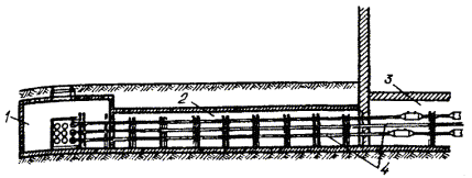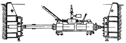 2.78. Устройство горизонтальной скважины производится в следующей последовательности: а) отрывается входной (рабочий) котлован прямоугольной формы длиной 220 см и шириной 160 см, дно которого должно располагаться на 50 см ниже оси прокладываемых трубопроводов (глубина заложения трубопровода определяется проектом). На дне котлована должен быть сделан настил из досок толщиной 40 мм, закрепленных на трех поперечных брусьях 150´100 мм. Отрывается также траншея на другой стороне перехода; б) закрепляются стенки котлована способами, указанными в п. 2.73; в) устанавливается строго горизонтально (по уровню) гидропресс. Опорные плиты устанавливаются параллельно и вертикально (рис. 2.16); г) после запуска установки в грунт заталкивается первая штанга с навинченным конусообразным наконечником диаметром 70 мм. По мере вдавливания в грунт штанги навинчиваются друг на друга до появления первой штанги с наконечником в траншее на другой стороне перехода; д) сняв наконечник диаметром 70 мм, на конец штанги навинчивают расширитель диаметром 130 мм и штангу с расширителем протягивают в скважине в обратном направлении. Диаметр скважины можно увеличить, последовательно протягивая штангу с расширителями диаметром 170, 210 и 250 мм в обоих направлениях; е) в скважину затягивают асбестоцементные трубы, как указано в п. 2.76 н). Рис. 2.16. Установка гидравлического пресса в рабочем котловане УСТРОЙСТВО КАБЕЛЬНЫХ ПЕРЕХОДОВ С ПРОКЛАДКОЙ АСБЕСТОЦЕМЕНТНЫХ ТРУБ В МЕТАЛЛИЧЕСКИХ ФУТЛЯРАХ2.79. Бестраншейная прокладка трубопроводов кабельной канализации через железные и автомобильные дороги при количестве каналов больше шести производится, как правило, с устройством металлического футляра методом продавливания. Этот способ заключается в том, что продавливаемая труба концом, снабженным ножом, вдавливается в массив грунта, после чего образовавшийся грунтовый керн разрабатывают и удаляют из трубы (футляра). 2.80. Установки для продавливания металлических футляров, как правило, монтируются с применением гидродомкратов ГД-170/1150, ГД-170/1600 или ГД-500/600, насосов высокого давления и контрольных приборов. Указанные выше домкраты имеют обратный ход. 2.81. Наиболее распространенными установками для продавливания металлических футляров являются: установка, разработанная СКБ Главмосстроя, установка ПУ-2 конструкции ЦНИИподземмаш и установка У-12/60 Гипронефтеспецмонтажа. 2.82. Установка СКВ Главмосстроя, например, имеет следующие технические данные: Диаметр кожуха, мм............................................................................................ 920 Максимальная длина прокладки, м................................................................... до 60 Скорость прокладки, м/смена............................................................................. 6 - 10 Ход штоков гидродомкратов, мм....................................................................... 1150 Давление в гидросистеме, мПа.......................................................................... 30 Максимальное усилие гидродомкратов, кН...................................................... 3400 Общая установленная мощность, кВт................................................................ 51,5 Общая масса установки, т................................................................................... 13 Технология применения этой установки приведена в типовых проектных решениях «Бестраншейная прокладка трубопроводов канализации кабелей связи 1-045-3-86», разработанных проектным институтом «Гипросвязь-2». 2.83. Установка У-12/60 для бестраншейной прокладки труб предназначена для про