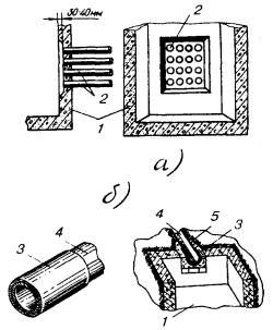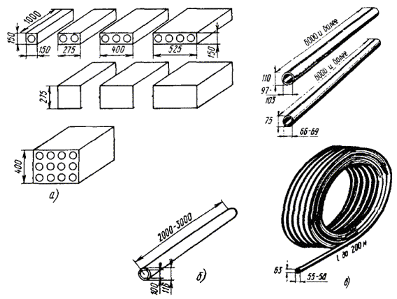 Примечания: 1. Колодец ККС-1-10 в ТУ не учтен. 2. Колодцы 5 - 1 типоразмеров раньше назывались соответственно колодцами большого, среднего, малого типов, коробками большого и малого типов. 3. Станционные колодцы классифицируются соответственно емкости АТС. 3.75. Типы применяемых колодцев определяются проектом в зависимости от числа каналов трубопровода на каждом участке трассы, его направления (поворота и разветвления), емкости АТС, прокладки на пешеходной или проезжей частях улиц и перспектив развития сети на заданный период с учетом последующей докладки трубопровода без переустройства колодцев. Необходимость и способы гидроизоляции колодцев, предотвращения их разрушения в грунтах, подверженных пучению, морозобойным трещинам, смещению в неустойчивых почвах (плывунах, заболоченных участках, оврагах) определяются в процессе проектирования. ОСНОВНЫЕ МАТЕРИАЛЫ ДЛЯ СТРОИТЕЛЬСТВА И ИЗГОТОВЛЕНИЯ КОЛОДЦЕВ КАБЕЛЬНОЙ СВЯЗИ И ДРУГИХ УСТРОЙСТВ КАНАЛИЗАЦИИ3.76. Основными материалами для изготовления и строительства колодцев и других устройств кабельной канализации являются цемент, песок (гравий, щебень), используемая для их затворения вода, а также кирпич и арматурная сталь. 3.77. Для образования бетона (искусственного камня) цемент с заполнителями (песок, гравий, щебень) затворяют чистой водой в определенных весовых соотношениях. В зависимости от предела прочности установлены марки бетона: 50, 75, 100, 150, 200, 300, 400 и 500. Созревающий бетон необходимо предохранять от сотрясений и высыхания. В отличие от бетона цементно-песчаные растворы приготовляют из цемента и песка, затворяемых водой. В зависимости от соотношений компонентов растворы подразделяются по маркам: 25, 50, 75 и 100. 3.78. Для повышения прочности бетонных конструкций, подвергающихся воздействию растягивающих, изгибающих и скалывающих усилий, в них при изготовлении вводят стальные арматурные каркасы из отдельных стержней, скрепляемых проволокой или сваркой. В качестве арматуры должны использоваться горячекатанные круглые стержни гладкого или периодического профиля шести классов (от А-I до А-VI) диаметром 6 мм и более. Изделия называют железобетонными. 3.79. Для кирпичных сооружений связи должен использоваться глиняный красный кирпич прямоугольной формы семи марок: 75 - 300. Строительство кирпичных колодцев должно производиться из такого кирпича марки 75. 3.80. От качества и правильности дозировки используемых компонентов зависит прочность и длительность срока службы построенных сооружений, поэтому они должны строго контролироваться. 3.81. Технические данные бетонов, цементно-песчаных растворов и кирпича, используемых при строительстве сооружений связи, приведены в табл. 3.5 - 3.7. Таблица 3.5 Марки бетонов, цементно-песчаных растворов и кирпича, применяемых для строительства кабельных колодцев связи