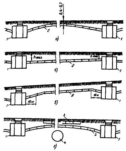 Примечания: 1. Под трамвайными и железнодорожными путями расстояние от подошвы рельса до верха трубы любого типа должно составлять не менее 1 м. 2. Под арыками и кюветами расстояние от их дна до верхней трубы должно составлять не менее 0,5 м. 3. При вероятности докладки труб минимальное заглубление должно учитывать планируемую докладку. 4. Под проезжими частями улиц полиэтиленовые трубы должны иметь дополнительную защиту. 5. Приведенные данные относятся к заглублению трубопроводов в пролетах. На вводах труб в колодцы глубина заложения должна составлять не менее 0,7 м под пешеходной и 0,8 м - под проезжей частями улиц. Таблица 3.2 Минимальная глубина траншей для трубопроводов кабельной канализации в наивысшей точке пролета, м