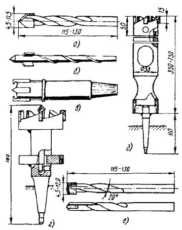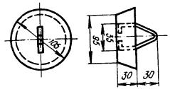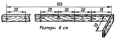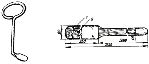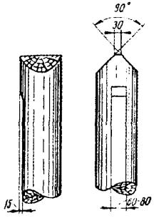 Ручной инструмент в номенклатуре и количестве, приведенном в Нормокомплекте ГТС ЛС-7. Примечания: 1. Производительность специально оборудованной площадки с указанным набором средств механизации составляет 20 обработанных и оснащенных опор и 45 оснащенных восьмиштырных траверс в смену (8 ч). 2. Производительность подвижного узла механизации 10 - 12 обработанных опор и 22 оснащенных траверсы в смену. 8.25. При изготовлении и оснастке опор необходимо выполнять следующие указания и рекомендации: а) удаление с поверхности коры и луба производить с помощью электросучкорезки, а при ее отсутствии - окорочной лопатой и стругом; б) запиловку или затеску вершины столба на два ската делать под углом 45 градусов с гребнем шириной 30 мм (см. рис. 8.5). Столбы, имеющие одностороннюю кривизну, затесывать так, чтобы кривизна столба была направлена вдоль линии. Для запиловки вершины, обрезки столбов рекомендуется использовать бензомоторную пилу «Дружба» или электропилу. При отсутствии средств механизации применяются ручные пилы. Разметку заделки вершины столба рекомендуется производить с помощью шаблона (рис. 8.6); Рис. 8.5. Правильно обработанная вершина опоры Рис. 8.6. Шаблон для разметки опиловки или затески вершины опоры Шаблон может быть изготовлен из 2 - 3 мм фанеры, картона или листовой стали толщиной 0,5 - 0,7 мм. а) оснастка столба должна производиться так, чтобы после его установки гребень был расположен: при оснастке крюками - перпендикулярно линии, при оснастке траверсами - по направлению линии; г) разметку отверстий в столбе для ввертывания крюков рекомендуется производить при помощи шаблона (рис. 8.7). Рис. 8.7. Шаблон разметки отверстий в столбе для ввертывания крюков Отверстия сверлятся с помощью электрической сверлильной машины, а на трассе - буравом. Диаметр сверла или бурава берется на 2 мм меньше диаметра нарезной части крюка. Глубина отверстий должна быть на 10 мм меньше длины нарезки крюка, для чего на сверле или бураве делается отметка, показывающая глубину отверстия. Крюк ввертывается сначала руками, а затем с помощью специального ключа, так чтобы после ввертывания расстояние между крюком и столбом равнялось 2 см, что может определяться толщиной ладони руки (рис. 8.8 а). На угловых, а также на всех опорах линий У и ОУ крюки следует ввертывать вплотную к опоре (рис. 8.8 б). На угловых опорах при вылете угла более 7,5 м на каждый провод должны устанавливаться два крюка, расположенные на расстоянии 80 мм друг от друга (рис. 8.8 в). Рис. 8.8. Правила ввертывания крюков Двойные крюки устанавливаются также на оконечных опорах. Оснастка опоры крюками с изоляторами показана на рис. 8.9. Рис. 8.9. Оснастка опоры крюками с изоляторами д) перед креплением деревянных траверс к столбу они должны быть оснащены штырями и изоляторами. В связи с тем, что штыри в отверстия деревянных траверс вставляются (забиваются) в большинстве случаев с усилием, рекомендуется эту трудоемкую операцию выполнять малооборотной электрической машиной, оснащенной торцовым ключом для ввертывания штырей (рис. 8.10). Гайки рекомендуется завинчивать с помощью гайковерта или электрической машиной, оснащенной гайковертной муфтой максимального момента. Рис. 8.10. Торцовый ключ для ввертывания штырей деревянных траверс Траверсы стальные для воздушных линий должны выпускаться оснащенными штырями и подкосами (