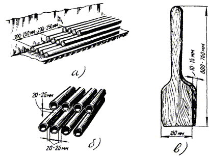 2.52. Крепить траншеи и котлованы глубиной до 5 м следует, как правило, инвентарными приспособлениями. Инвентарные металлические винтовые распорки (рис. 2.9) применяют для сокращения расхода лесных материалов. При глубине более 3 м крепления должны производиться по отдельным проектам, утвержденным руководством строительной организации. 2.53. При отсутствии инвентарных приспособлений детали крепления траншей и котлованов должны изготавливаться на месте с соблюдением следующих требований: а) для крепления грунтов естественной влажности (кроме песчаных) должны применяться доски толщиной не менее 40 мм, а для грунтов повышенной влажности - не менее 50 мм. Доски следует укладывать за вертикальные стойки вплотную к грунту с укреплением распорками; б) стойки креплений должны устанавливаться не реже чем через 1,5 м; в) расстояние между распорками по вертикали не должно превышать 1 м. Распорки закрепляются упором; г) над бровками верхние доски должны выступать не менее чем на 15 см; д) узлы креплений, на которые опираются полки для переброски грунта, необходимо сделать усиленными. Полки ограждаются бортовыми досками высотой не менее 15 см. 2.54. Разработку выемок в грунтах, насыщенных водой (плывунах), следует осуществлять по индивидуальным проектам, предусматривающим безопасные способы производства работ - искусственное водопонижение, шпунтовое крепление и др. 2.55. Крепления котлованов и траншей следует разбирать снизу вверх, по мере обратной засыпки грунта и одновременно снимать не более двух-трех досок в нормальном грунте, не более одной доски - в плывунах. Перед удалением досок нижней части крепления выше должны устанавливаться временные косые распорки, причем старые распорки разрешается удалять только после установки новых; крепления должны разбираться в присутствии ответственного исполнителя работ. В местах, где разборка креплений может вызвать повреждения строящихся сооружений, а также в грунтах-плывунах возможно крепления частично или полностью оставлять в грунте. 2.56. Стенки котлованов и траншей, разрабатываемых землеройными машинами, должны крепиться готовыми щитами, которые опускают и распирают сверху (рабочим опускаться в нераскрепленную траншею запрещается). Разработку траншей землеройными машинами без устройства креплений необходимо вести с откосами. 2.57. Необходимость, объем и способ крепления траншей определяются проектно-сметной документацией. Рис. 2.8. Способы крепления стенок траншей и котлованов: а) горизонтально-рамное; б) горизонтально-сплошное; в) горизонтальное с прозорами; г) смешанное: горизонтальное, сплошное и шпунты; д) вертикально-рамное; е) вертикально-сплошное Рис. 2.9. Винтовые распорки для крепления траншей ЗАСЫПКА ТРАНШЕЙ И КОТЛОВАНОВ, ОТВОЗКА ГРУНТА2.58. При засыпке траншей и котлованов на загородных участках трассы прокладки кабеля должны быть установлены в соответствующих местах замерные столбики. Все подземные сооружения (муфты, кабель, проложенные трубы и т.п.) должны быть зафиксированы в рабочих чертежах проекта и «привязаны» к постоянным ориентирам. Засыпку траншей и котлованов, как правило, следует производить с помощью механизмов: бульдозеров и траншеезасыпщиков. 2.59. На городских участках траншеи следует засыпать вынутым грунтом с таким расчетом, чтобы наиболее рыхлая его часть отсыпалась 