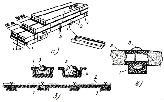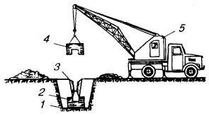 Примечания: 1. На колодцы для АТС емкостью 3000 номеров устанавливается один люк, на другие колодцы - по два люка. 2. Перекрытия станционных колодцев устраивают из типовых железобетонных плит П-1-80(10), П-2-80(10) и П-3-80(10). 3.90. Транспортировка и монтаж сборных железобетонных колодцев допускается при достижении ими не менее 70 % проектной прочности. Работы выполняют при помощи автокранов с соответствующей грузоподъемностью и вылетом стрелы. Крепление строп производят за стальные петли, вмонтированные при изготовлении колодца или его деталей и связанные с арматурным каркасом. 3.91. Наиболее рациональной является схема организации работ, при которой колодец или его элементы выгружаются с автомашины сразу в котлован (рис. 3.29). При этом должно выверяться его правильное положение в вертикальной и горизонтальной плоскостях при помощи рейки, уровня и отвеса. 3.92. В местах стыковки половин или отдельных элементов колодца на каждую уложенную часть (деталь) должен наноситься слой цементно-песчаного раствора толщиной 5 - 10 мм. Перед наложением раствора все стыкуемые поверхности должны смачиваться водой для более прочного схватывания цементно-песчаной массы с бетоном изделий. После сборки колодца излишки раствора следует удалить или дополнить, если его недостаточно, тщательно разглаживая все швы. В случаях, предусмотренных проектом, отдельные элементы сборного колодца скрепляют между собой при помощи стальных накладок, свариваемых с их арматурным каркасом. Рис. 3.29. Монтаж сборного железобетонного колодца: 1 - котлован; 2 - нижняя часть колодца; 3 - траншея; 4 - верхняя часть колодца; 5 - автокран 3.93. Сборка угловых и разветвительных колодцев должна осуществляться с предварительной пробивкой окон (проемов) в стенках проходных колодцев для угловых вставок. Эти работы выполняются до установки колодцев в котлован. При использовании двухэлементных угловых вставок сначала к проему необходимо пристроить нижнюю ее часть с упором в стенку проема и ненарушенное дно котлована. Затем на верхний срез нижней половины следует нанести цементно-песчаный раствор и опустить верхнюю часть. Все стыкуемые поверхности необходимо смачивать водой, а по окончании работ - загладить швы стыковки. 3.94. Сборные железобетонные колодцы специального типа строятся по отдельному проектному решению и рабочим чертежам применительно к данной местности. Наиболее приемлемым является опробованный способ монтажа колодцев, когда на выровненное и хорошо утрамбованное дно котлована наносят слой бетонной подготовки толщиной 100 мм. Стеновые блоки устанавливают на уложенную подготовку во взаимнопротивоположных положениях, внутрь нижними горизонтальными плоскостями (подошвами). Жесткая связь между стеновыми блоками (подошвами) в днище обеспечивается петлевыми выпусками арматуры, через которые пропускают стальной стержень с последующим тонированием. Плиты перекрытия связывают между собой и со стеновыми блоками накладными металлическими деталями, привариваемыми к таким же деталям сборных железобетонных элементов. Все пазы между стеновыми блоками, плитами перекрытий и днищем заполняются цементно-песчаным раствором. Штыри для крепления кронштейнов приваривают специальным арматурным выпускам каркаса стеновых блоков. Аналогично крепят и другие устройства для иных коммуникаций. 3.