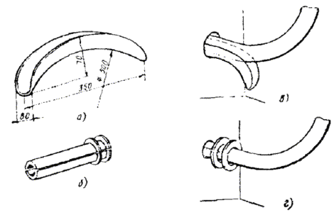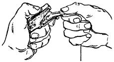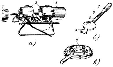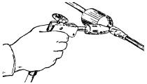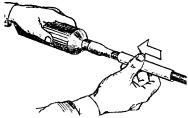 На другом конце вытягиваемого участка проволоку зажать в блочную лапку, присоединенную к блокам через динамометр Рис. 8.30. Закрепление проволоки при вытягивании: а - у основания начальной опоры; б - у конечной опоры 8.65. Сталеалюминиевую проволоку АС перед подвеской необходимо вытягивать с помощью деревянного зажима (рис. 8.31). Величина силы тяжения, контролируемая динамометром, должна быть равна для АС-10-981 Н (100 кгс), для АС-16-1471,5 Н (150 кгс) и для АС-25-2943 Н (300 кгс). 8.66. Концы стальных проводов, как правило, соединяются при помощи термитно-муфельных патронов и специальных сварочных клещей (рис. 8.32). При этом необходимо: а) торцы свариваемых проводов подравнять напильником под прямым углом; б) рычаг клещей отвести до отказа, затем концы свариваемых проводов зажать в клещи с таким расчетом, чтобы стык проводов находился примерно в середине между зажимами; Рис. 8.31. Деревянный зажим для вытягивания проволоки Рис. 8.32. Сварка стальных проводов Рис. 8.33. Термитно-муфельный патрон Рис. 8.34. Образцы термитно-муфельной сварки проводов: а - правильно; б и в - неправильно Масса муфельного патрона