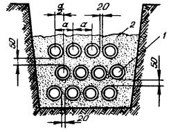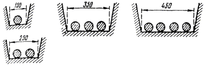 РАЗРАБОТКА ГРУНТОВ В ТРАНШЕЯХ И КОТЛОВАНАХ ОТКРЫТЫМ СПОСОБОМ2.35. Траншеи и котлованы для прокладки и монтажа кабелей, а также для строительства кабельной канализации должны, как правило, отрываться механизированным способом. 2.36. В зависимости от типов линейно-кабельных сооружений и условий выполнения земляных работ рекомендуется применять следующие землеройные механизмы: а) при рытье траншей на загородных участках кабельных линий СТС, а также для прокладки трубопроводов в городских районах новой застройки - экскаваторы непрерывного действия цепные и роторные, например, типа ЭТЦ-165, ЭТЦ-208Д, ЭТЦ-252, ЭТР-161, ЭТР-134, ЭТР -204, а при малых объемах - одноковшовые экскаваторы, например, типа ЭО-2621В, Э-304Г, ЭО-3322Б1; б) при рытье котлованов для установки сборных железобетонных колодцев кабельной канализации, монтажа муфт в грунте, а также для устройства НУП и НРП - экскаваторы одноковшовые, например, типа ЭО-2621В, Э-304Г. 2.37. Ширина траншей, разрабатываемых землеройными механизмами, определяется размерами рабочего органа (ковша, скребка). 2.38. Ширина траншей при ручном способе разработки в зависимости от количества прокладываемых кабелей и глубины их прокладки приведена в табл. 2.4. 2.39. При разработке в отвал грунт следует складывать: а) у котлованов и у траншей глубиной до 1,2 м - на расстоянии не менее 0,5 м от бровки (в населенных пунктах - со стороны проезжей части улиц); б) у котлованов глубиной более 1,2 м - на расстоянии не менее 1 м от бровки. При рытье котлованов допускается выбрасывать грунт на две стороны. Таблица 2.4 Ширина траншей при ручном способе разработки