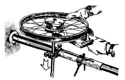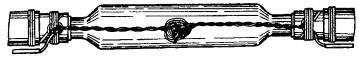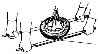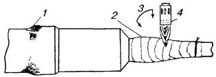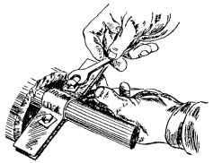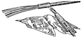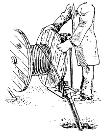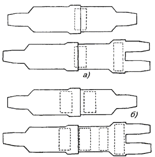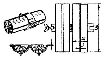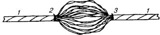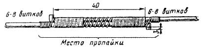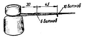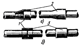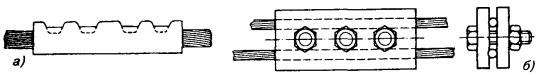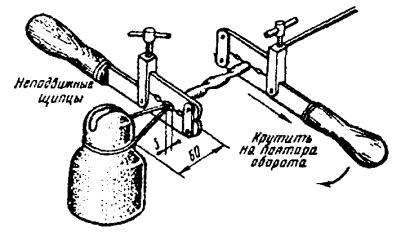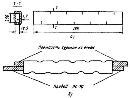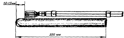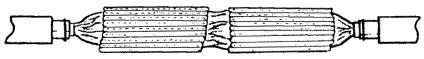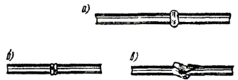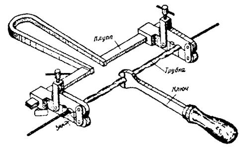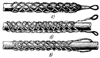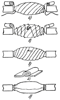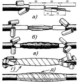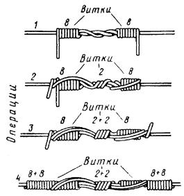 в) на один из концов провода надеть термитно-муфельный патрон (рис. 8.33); клещи свести до отказа, патрон надвинуть так, чтобы середина его приблизительно совпадала с плоскостью стыка проводов; если патрон идет по проводу туго, нужно его сдвинуть, удалить со стыка обычно образующуюся в этом случае термитную пыль, а затем установить патрон обратно; г) надев предохранительные очки, сварщик должен поджечь термитной спичкой патрон; д) после того, как патрон сгорит, клещи постепенно свести до отказа; е) когда сгоревший патрон остынет до потемнения, его следует сбить с провода в специальное корытце, клещи снять с провода. Для сварки коррозированных проводов рекомендуется применять буру. Кривые сварки должны переделываться. Такая сварка обычно происходит из-за неправильной установки проводов в клещах или из-за преждевременного сжатия клещей (рис. 8.34). Сваренный провод по 10 см в одну и другую стороны от места сварки необходимо покрыть суриком или битумом. 8.67. Провода диаметром 1,5 - 2,0 мм следует соединять скруткой так, как показано на рис. 8.35. Сначала провода нужно скрутить между собой, а затем каждый из концов проводов плотно намотать на провода. Далее правый конец провода отогнуть влево, сделать в разгонку два оборота в середине скрутки и восемь витков вокруг левого провода. Такую же операцию, но в противоположном направлении, проделать и с левым концом провода. Рис. 8.35. Соединение проводов скруткой 8.68. Медные и биметаллические сталемедные провода следует соединять при помощи медных трубок. При этом концы проводов зачищают мелкой наждачной бумагой на длине 160 мм и вводят в трубки так, чтобы они выступали на 5 мм из нее с обоих концов. Затем концы трубки зажимают в струбцинах клуппа (рис. 8.36) и ключом, устанавливаемым посередине трубки, делают полтора оборота. Рис. 8.36. Соединение проводов при помощи медных трубок 8.69. Стальной провод с биметаллическим должен соединяться термитной сваркой. 8.70. Концы сталеалюминевых проводов марки АС следует соединять при помощи алюминиевых трубок длиной 250 мм. Для соединения концы проводов нужно зачистить мелкой наждачной бумагой на длину 300 мм и ввести трубку так, чтобы они выступали из нее на 50 мм с обоих концов. Затем концы трубки зажать щипцами и закрутить ее, делая три полных оборота по часовой стрелке одними из щипцов, вторые щипцы должны оставаться при этом неподвижными. 8.71. При соединении медных и биметаллических сталемедных проводов с проводами АС медный или биметаллический провод необходимо залудить равномерным слоем ПОС-30, а затем соединить с проводом АС с помощью алюминиевой трубки (соединителя). В виде исключения допускается соединение стальных проводов наложением на сросток плотного бандажа из оцинкованной перевязочной проволоки и пропайкой сростка припоем ПОССу-30-2 (рис. 8.37). Рис. 8.37. Соединение стальных проводов наложением на сросток бандажа из оцинкованной перевязочной проволоки В качестве флюса служит паяльная кислота или паяльная паста. Перед наложением бандажа линейные провода должны быть тщательно зачищены личным напильником или наждачной бумагой (до металлического блеска). ПОДВЕСКА И РЕГУЛИРОВАНИЕ ПРОВОДОВ8.72. После размотки и вытяжки проводов их поднимают с земли на опоры с помощью шестов с вилками или при помощи веревок с крючками. При этом каждый провод укладывается в желоба изол