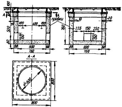 Примечание. В числителе указаны размеры в пешеходной части улиц, а в знаменателе - в проезжей. Таблица 3.13 Основные размеры типовых разветвительных кирпичных колодцев, мм