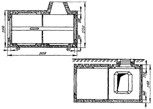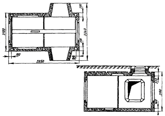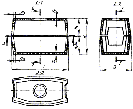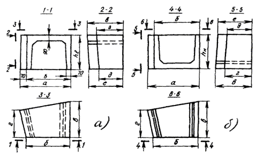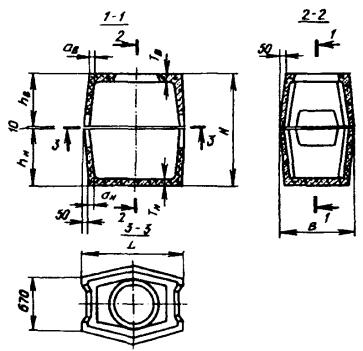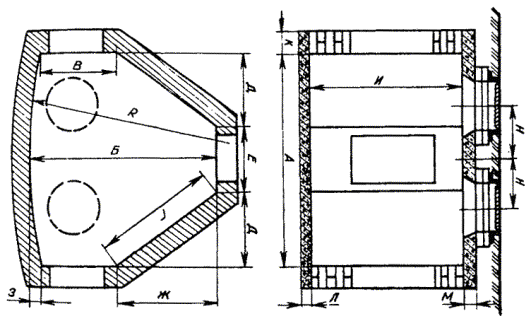 Примечания: 1. Размеры колодцев ККС-1 показаны на рис. 3.16. 2. Конструкция и основные размеры колодца ККС-5М, предназначенного для размещения в нем контейнеров НРП-12 и аппаратуры ИКМ-30, отличаются от колодца ККС-5-80 лишь некоторыми деталями, имея те же основные размеры. Рис. 3.21. Проходной сборный железобетонный колодец специального типа ККСС-1 на 25 - 36 каналов трубопровода Рис. 3.22. Проходной сборный железобетонный колодец специального типа ККСС-2 на 37 - 48 каналов трубопровода Рис. 3.23. Угловой сборный железобетонный колодец специального типа ККССу-1 Рис. 3.24. Разветвительный сборный железобетонный колодец специального типа ККССр-1 Угловые колодцы типа ККССу-2 и разветвительные ККССр-2 монтируют из проходных колодцев ККСС-2 и угловых вставок аналогично изображенным на рис. 3.23 и 3.24. 3.87. Угловые вставки к сборным железобетонным проходным колодцам представляют собой специальные железобетонные устройства (карманы), пристраиваемые к типовым проходным колодцам для ввода трубопровода со стороны поворота или разветвления трассы канализации. Такие вставки изготовляются из двух частей (половин): верхней и нижней. При сборке в заводских условиях вставки к колодцам типа ККС-4 и ККС-3, кроме того, могут применяться и цельными. Двухэлементные угловые вставки к колодцам типа ККС-3-80(10), ККС-4-80(10) и ККС-5-80(10) изображены на рис. 3.25, а одноэлементные вставки к колодцам типа ККС-3-80(10) и ККС-4-80(10) - на рис. 3.26. Их размеры приведены в табл. 3.9. Разработаны и применяются также конструкции цельных и двухэлементных угловых вставок для установки на существующем блоке к сборным железобетонным колодцам специального типа. Рис. 3.25. Двухэлементная угловая вставка к сборным железобетонным колодцам типа ККС-3-80(10), ККС-4-80(10) и ККС-5-80(10): а) верх (ККС-3-В1); б) низ (ККС-3-В2) Рис. 3.26. Одноэлементная угловая вставка к сборным железобетонным колодцам типа ККС-3-80(10) и ККС-4-80(10) Таблица 3.9 Основные размеры угловых вставок, мм