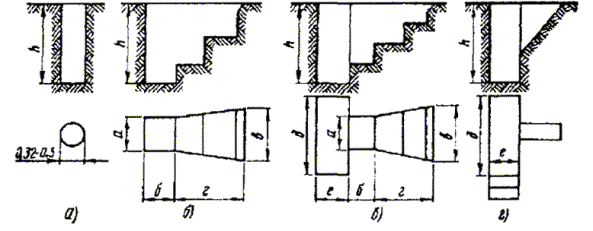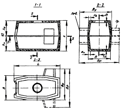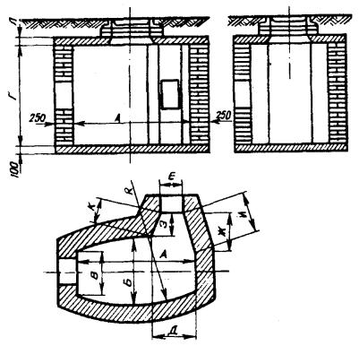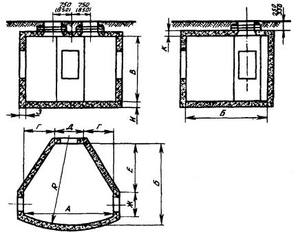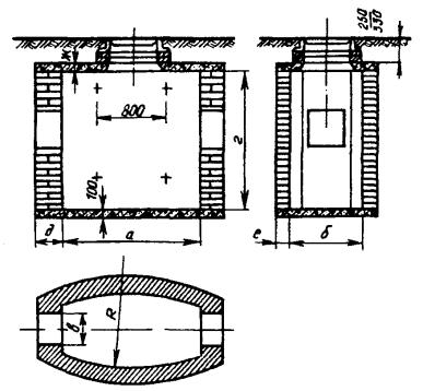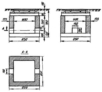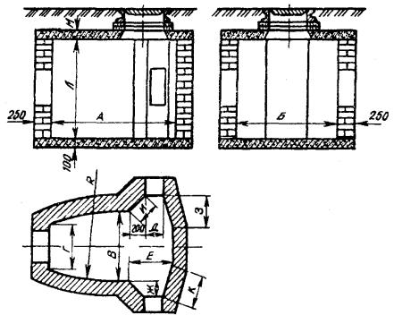 Примечание. В числителе указаны размеры в пешеходной части улиц, а в знаменателе - в проезжей. 3.104. Конфигурация типовых станционных колодцев представлена рис. 3.34, а их основные размеры - в табл. 3.14. Рис. 3.34. Станционные кирпичные колодцы Таблица 3.14 Основные размеры станционных кирпичных колодцев, мм