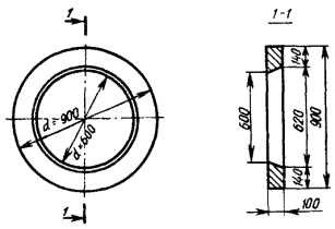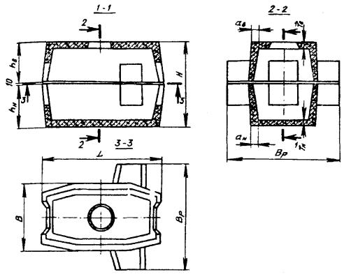 3.88. Опорное железобетонное кольцо ОК-1 под люк колодца (рис. 3.27) устанавливается в створ с круглым отверстием в перекрытии. В зависимости от глубины заложения перекрытия колодца с уровнем дорожного покрытия под каждый люк может быть подложено одно или несколько опорных колец. Рис. 3.27. Опорное железобетонное кольцо под люк колодца 3.89. Типовые железобетонные станционные колодцы строятся четырех типоразмеров: для АТС емкостью 3, 6, 10 и 20 тысяч номеров. Конструкция станционных колодцев показана на рис. 3.28, основные размеры приведены в табл. 3.10. Рис. 3.28. Станционный железобетонный колодец Таблица 3.10 Основные размеры монолитных железобетонных колодцев станционного типа, м