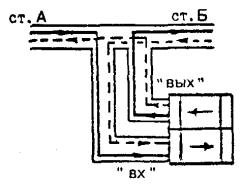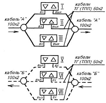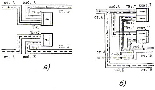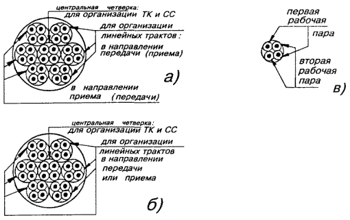 Рис. 13.6. Однокабельный вариант включения НРП-6 Рис. 13.7. Назначение четверок в кабеле МКС 7´4´1,2: а) для однокабельного варианта включения; б) для двухкабельного варианта включения; в) рабочие пары внутри четверки Таблица 13.1 ВКЛЮЧЕНИЕ ЛИНЕЙНОГО КАБЕЛЯ В ПЛАТУ ОЛП Станция «А» (или «Б») Таблица 13.2 ВКЛЮЧЕНИЕ ЛИНЕЙНОГО КАБЕЛЯ В ПЛАТУ ОЛП Станция «А»