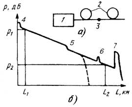 МЕТОД ОБРАТНОГО РАССЕЯНИЯ15.13. Метод пригоден для определения распределения оптических потерь по длине волокна, затухания волокна, неоднородностей (обрыв, место сварки и т.д.), значения потерь на неоднородностях, а также длины волокна и расстояния до мест обрыва. 15.14. Схема измерения затухания методом обратного рассеяния с помощью рефлектометра показана на рис. 15.2, а, а график распределения уровня мощности обратного рассеяния - на рис. 15.2, б. Рис. 15.2. Измерение затухания методом обратного рассеяния: а) схема измерения; б) рефлектограмма 1 - рефлектометр; 2 - отрезки кабеля строительной длины; 3 - место соединения строительных длин; 4 - точка соединения кабеля с прибором; 5 - точка соединения строительных длин; 6 - место неоднородности; 7 - конец кабеля 15.15. Следует учитывать, что рефлектометры, в зависимости от их динамического диапазона, позволяют проводить измерения в линии с затуханием не более 15 - 20 дБ, в связи с чем может возникнуть необходимость в проведении работ по сращиванию строительных длин и измерениям с разбивкой линии ВОЛС на участки. Основные характеристики применяемых рефлектометров приведены в табл. 15.2. Таблица 15.2