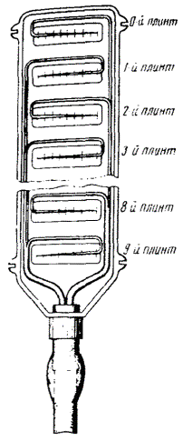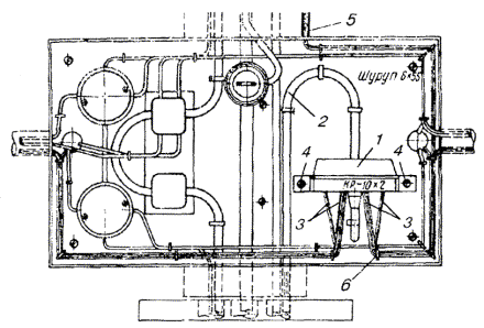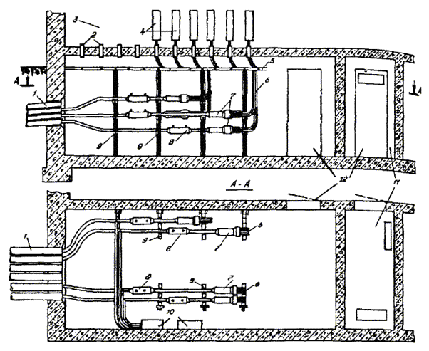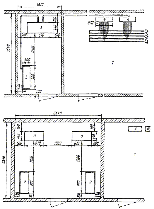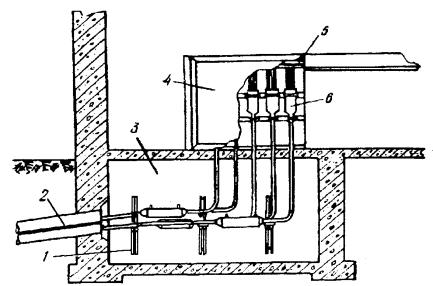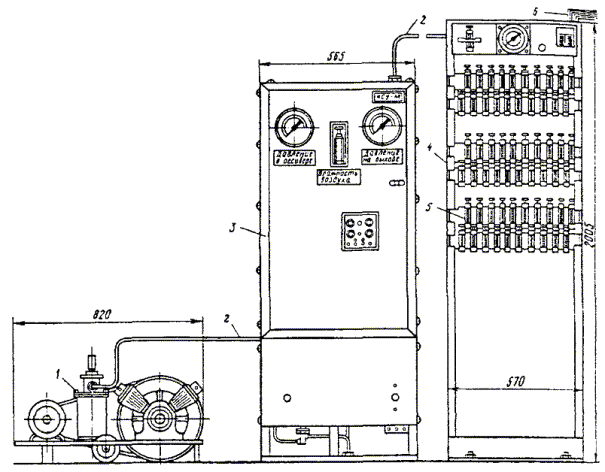 МОНТАЖ УСТАНОВКИ КСУ-2М16.44. Размещение установки КСУ-2М должно производиться в соответствии с рабочей документацией проекта. Компрессор, блок осушки и автоматики, стативы установки устанавливаются на фундаменты. Устройство фундаментов необходимо осуществлять в соответствии с рекомендациями, изложенными в инструкции по эксплуатации 3т2.959.008 ИЭ. Блок осушки и автоматики устанавливают на фундамент по отвесу и закрепляют фундаментными болтами. Распределительный статив в верхней части крепится к стене планками, изготовленными из угловой стали. Примерное размещение КСУ-2М показано на рис. 16.3. Рис. 16.3. Размещение КСУ-2М: а) размещение КСУ-2М на 30 или 60 кабелей; б) размещение двух КСУ-2М 1 - помещение ввода кабелей; 2 - компрессорная группа; 3 - блок осушки и автоматики; 4 - распределительные стативы 16.45. В блок осушки и автоматики необходимо установить ресивер, который поставляется отдельно, и произвести соединение узлов установки. Для этого следует снять заднюю стенку блока осушки и автоматики, вставить горловину ресивера в отверстие планки и закрепить ресивер в верхней части хомутом. 16.46. Произвести подсоединение с помощью воздуховодов входного штуцера ресивера к обратному клапану компрессора, выходного штуцера ресивера к маслоотделителю, выходного штуцера блока осушки и автоматики к выходным штуцерам распределительных стативов. 16.47. Подсоединение выходных штуцеров распределительных стативов к выходным штуцерам кабеля производится с помощью воздуховодов, в качестве которых применяются медицинские резиновые трубки типа 6 (ГОСТ 3399-76) или трубки гибкие поливинилхлоридные (ТУ6-05-1498-77) с внутренним диаметром 6 мм. 16.48. Подсоединение воздуховодов к кабелям с металлической оболочкой производится при помощи переходных штуцеров, которые входят в комплект поставки установки. 16.49. Подсоединение воздуховодов к кабелям с полиэтиленовой оболочкой производится при помощи полиэтиленовых патрубков. На место соединения воздуховодов накладывается стягивающий бандаж из проволоки. 16.50. При размещении распределительных стативов в помещении ввода кабелей герметизация места прохода воздуховодов, соединяющих блок осушки и автоматики с распределительными стативами, через стенку помещения ввода кабелей обеспечивается при помощи технической замазки (мел - 80 %, олифа - 20 %) или с помощью мастики нетвердеющей герметизирующей строительной (ГОСТ 14791-79). 16.51. При размещении распределительных стативов в компрессорном помещении герметизация места прохода воздуховодов, соединяющих выходы распределительных стативов с кабелями, через стенку помещения ввода кабелей обеспечивается при помощи предварительно изготовленного блока воздуховодов. 16.52. Для изготовления блока воздуховодов необходимо подготовить опалубку, сквозь стенки которой пропускают 30 медных трубок с внутренним диаметром 6 мм (трубки М3-М-8´1 ГОСТ 617-90). Подготовленную форму заливают раствором бетона и оставляют на 6 - 8 суток для схватывания бетона. 16.53. В стене в соответствии с размерами блока воздуховодов прорубается окно, в которое вставляется блок, и место стыка по периметру заделывается цементным раствором. Воздуховоды со стороны компрессорного помещения и помещения ввода подсоединяются к медным трубкам блока воздуховодов. На место соединения накладывается бандаж из проволоки. 16.54. Элект