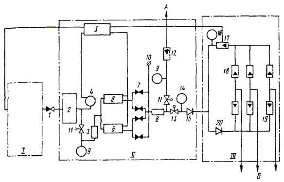 КОМПРЕССОРНО-СИГНАЛЬНАЯ УСТАНОВКА КСУ-2М16.42. Основным оборудованием для содержания кабелей ГТС под постоянным избыточным воздушным давлением является компрессорно-сигнальная установка типа КСУ-2М. Установка обеспечивает: · содержание под избыточным воздушным давлением до 30 или до 60 кабелей емкостью от 100 до 2400 пар или других типов, в том числе соответственно не более трех или не более шести кабелей с поврежденной оболочкой при расходе воздуха не более 35 л/мин; · контроль за давлением воздуха в ресивере и на выходе установки, за расходом воздуха, подаваемого в кабели; · контроль влажности воздуха, подаваемого в кабели, по изменению цвета индикаторного силикагеля в индикаторе влажности; · автоматическую замену осушительных камер и регенерацию силикагеля без его извлечения; · подачу сигналов при нарушении герметичности оболочек кабелей и нарушении работы установки (пропадание переменного или постоянного тока, перегрузка электродвигателя компрессора и включение осушительной камеры на регенерацию). 16.43. Конструктивно КСУ-2М (рис. 16.1) состоит из компрессора, блока осушки и автоматики и одного или двух распределительных стативов, устанавливаемых на одном каркасе, а также - щитка выносной сигнализации. Функциональная схема КСУ-2М приведена на рис. 16.2. Основные технические характеристики КСУ-2М приведены в табл. 16.3. Рис. 16.1. Компрессорно-сигнальная установка КСУ-2М: 1 - компрессорная группа; 2 - воздуховод; 3 - блок осушки и автоматики; 4 - распределительный статив; 5 - ротаметр; 6 - трубки к кабелям Рис. 16.2. Функциональная схема КСУ-2М: I - компрессорная группа; II - блок осушки и автоматики; III - распределительный статив 1 - обратный клапан; 2 - ресивер; 3 - воздушный фильтр; 4 - электронно-контактный манометр (ЭКМ); 5 - блок автоматики и сигнализации; 6 - осушительные камеры; 7 - клапаны КЭП; 8 - индикатор влажности; 9, 14, 16 - манометры; 10 - выход дюзы; 11 - редуктор РДВ-0,5; 12 - ротаметр; 13 - редуктор РДВ-0,6; 15 - выходной вентиль; 17 - сигнальный ротаметр; 18 - ротаметры с эбонитовыми поплавками; 19 - ротаметры со стальными поплавками; 20 - обводной вентиль; А - выход к поврежденным кабелям; Б - выход к кабелям ГТС Таблица 16.3 Основные технические характеристики установки КСУ-2М