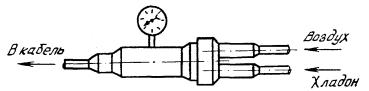 Примечание. В состав ЭТЗК-3 входит также полиэфир МГф-9 в количестве 10 весовых частей. Компоненты компаунда ЭТЗК хранятся и доставляются к месту производства работ расфасованными в герметично закрытые емкости (полиэтиленовые пакеты, банки, стеклянные пузырьки). Эпоксидный компонент ЭТЗК и тиокол выливаются в подготовленную сухую и чистую (обезжиренную ацетоном) емкость и в течение 10 - 15 мин тщательно перемешиваются в одном направлении металлической лопаточкой. До введения отвердителя полиэтиленполиамина (ПЭПА) приготовленный компаунд может храниться не более трех суток при температуре не выше +25 °С в герметично закрытой емкости. Перед заливкой муфты в компаунд вводится отвердитель, после чего компаунд вновь тщательно перемешиваете в одном направлении в течение 5 - 10 мин, при этом его температура повышается до +40 - 50 °С. Смешиваться должны только входящие в один комплект расфасованные компоненты. При использовании сразу нескольких однотипных комплектов ЭТЗК количество отвердителя должно соответствовать количеству остальных компонентов. Приготовление компаунда из компонентов, взятых из разнотипных комплектов, или составление компаунда без дозаторов не допускается. 11.124. После введения отвердителя компаунд должен быть использован в течение 30 - 40 мин. Готовый компаунд заливается в емкость, входящую в бачок, или в полиэтиленовый пакет и помещается в бачок, который герметично закрывается крышкой. При отрицательной температуре окружающего воздуха бачок предварительно подогревается, в бачок нагнетается воздух до создания избыточного давления величиной 0,098 - 0,2 МПа. Контроль за величиной давления осуществляется по показаниям манометра, установленного на крышке бачка. Компаунд должен проходить по трубке сплошным потоком. Характер движения компаунда оценивается визуально. При подъеме компаунда из свободного вентиля в трубку ее немедленно перегибают и перевязывают. Давление в бачке поддерживается до прекращения движения компаунда в трубке, соединяющей бачок с муфтой. После прекращения движения компаунда трубку перегибают и перевязывают у самого вентиля. В зависимости от типоразмера муфты время нагнетания компаунда составляет от 5 до 30 мин. Избыточное давление в бачке снижается путем ослабления зажимов крышки. Трубка, соединяющая бачок с муфтой, обрезается и удаляется. Выходной штуцер бачка и трубка, через которую осуществлялся забор компаунда, продуваются сильной струей воздуха для очистки их от остатков компаунда. 11.125. Смонтированную муфту оставляют в фиксированном положении до полного отвердения компаунда. Время отвердения в зависимости от температуры окружающего воздуха составляет: при температуре до +15 °С 48 ч; при 0 °С - 96 ч; при минус 15 °С - 240 ч. По истечении указанных сроков лишние концы полиэтиленовых трубок с отвердевшим компаундом удаляются с вентилей и муфта проверяется на герметичность. 11.126. Проверка герметичности ГНМ состоит в том, что один из прилегающих к муфте участков кабеля герметизируется колпачком с вентилем, и в герметичный участок кабеля нагнетается осушенный воздух до создания избыточного давления величиной не более 0,098 МПа. Муфта считается герметичной, если зафиксированное давление не изменяется в течение 24 ч с учетом поправки на изменение температуры. 11.127. В последнее время на кабелях мест