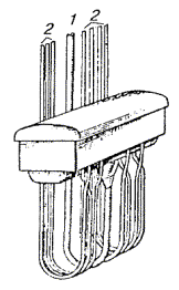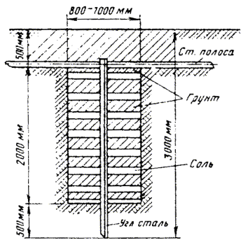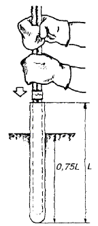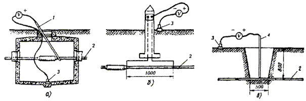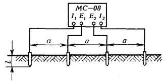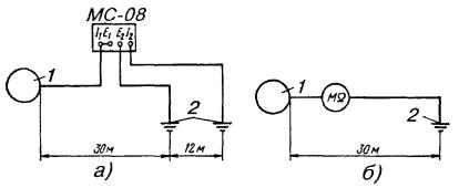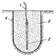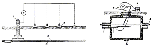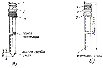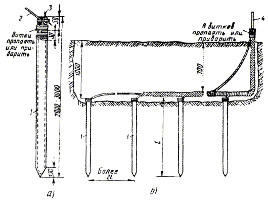 ОБОРУДОВАНИЕ ЗАЗЕМЛЯЮЩИХ УСТРОЙСТВ (ЗАЗЕМЛЕНИЙ)18.46. Места оборудования заземлений, их сопротивления растеканию, количество отдельных заземлителей в контуре заземляющего устройства определяются проектом. 18.47. Заземляющее устройство состоит из одного или нескольких металлических заземлителей, помещенных в грунт на глубину от 0,7 до 1,5 м от поверхности земли, и заземляющих проводников (соединительных шин или проволок). Стальные шины и проволока используются для протяженных заземлителей. 18.48. При оборудовании заземлений в первую очередь, независимо от наличия этих данных в проекте, необходимо измерить удельное сопротивление грунта, в котором предполагается устанавливать заземление, после чего сравнить полученные в результате измерений значения с указанными в проекте. Если измеренные величины оказались больше проектных (на 20 % и более), то пересчетом следует определить новое количество заземлителей, обеспечивающих требуемое сопротивление растеканию токов. При этом нужно учитывать коэффициент сезонного изменения удельного сопротивления. Если измеренные величины оказались равными или меньше указанных в проекте, то следует оборудовать заземляющее устройство в соответствии с проектом. 18.49. В зависимости от требуемой величины сопротивления растеканию Rз следует применять: · при Rз ³ 30 Ом - протяженные заземлители; · при 15 < Rз < 30 Ом - вертикальные одиночные или многоэлектродные заземлители; · при Rз £ 15 Ом - многоэлектродные или глубинные заземлители. 18.50. Во всех грунтах (кроме скальных и вечномерзлых) с удельным сопротивлением до 200 Ом×м для оборудования заземлений рекомендуется применять электроды из круглой стали диаметром 12 мм и длиной 5 м по ГОСТ 2590-88 или из прутковой стали диаметром 15 - 16 мм. Электроды из круглой стали вворачивают в грунт при помощи приспособлений ПЗД-12 на базе бензодвигателя пилы «Дружба» или ПВЭ на базе электросверлилки. В качестве вертикального стержневого заземлителя длиной до 3 м допускается использовать уголковую сталь 40´40´4, 45´45´4, 50´50´4 мм и некондиционные трубы диаметром 2 - 2,5 дюйма. 18.51. Устройство заземления из одной трубы показано на рис. 18.6, а, а из одного уголка - на рис. 18.6, б. Перед вбиванием электродов заземляющего устройства в грунт к каждому из них необходимо приварить или припаять стальную проволоку диаметром 4 - 5 мм. Рис. 18.6. Устройство заземления, изготовленное: а) из одной трубы; б) из одного уголка; 1 - хомутик из перевязочной проволоки диаметром 2 мм; 2 - стальная проволока диаметром 4 - 5 мм; 3 - витки пропаять или проварить Чтобы не повредить края трубы при забивке в грунт, в верхний ее конец вставляют стальной вкладыш с головкой, которая своими заплечиками опирается на срез трубы (рис. 18.7). Нижний конец трубы, забиваемой в грунт, предварительно сплющивают, как показано на рис. 18.6, а. Перед забивкой электродов в грунт для каждого из них следует выкопать яму глубиной 0,8 м. Электрод забивают в центре ямы так, чтобы верхний конец возвышался над уровнем дна ямы на 10 см. Рис. 18.7. Стальной вкладыш для забивки труб 1 - труба; 2 - вкладыш 18.52. Значения величин сопротивления растеканию одиночного заземлителя из уголка 40´40´4 мм при длине его от 1 до 2 м, верхний конец которого заглублен на 0,7 м от поверхности земли, приведены в табл. 18.11. Таблица 18.11 Сопротивления растеканию одиночного заземлителя из стального уголка 4