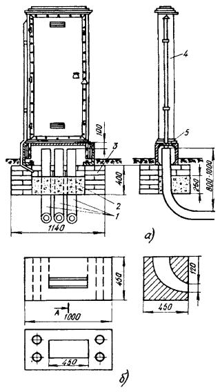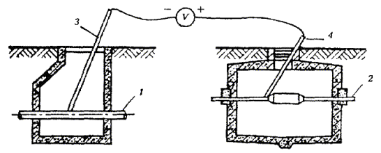 17.36. Места установки протекторов определяются проектом. При параллельной прокладке нескольких кабелей протекторные установки следует располагать с той стороны защищаемого кабеля, где достигается максимальное удаление их от других подземных металлических сооружений, находящихся вблизи. Расстояние между протекторной установкой и защищаемым сооружением связи должно быть: для одиночных протекторов - не менее 3 м, а для групповых протекторных установок - не менее 6 м, расстояние между отдельными протекторами в группе должно быть не менее 3 м. 17.37. При защите сооружений связи, находящихся непосредственно в земле, протекторы устанавливают в специально отрываемых шурфах, а при защите сооружений, находящихся в кабельной канализации, - вблизи телефонного колодца в местах, удобных для их эксплуатации. 17.38. К монтажным работам, связанным с установкой протекторов в грунте, относятся: · рытье шурфов и траншей для установки протекторов и рытье траншей для прокладки соединительных проводов; · установка протекторов; · прокладка и припайка соединительных проводов к защищаемым сооружениям связи, изоляция мест пайки и засыпка шурфов и траншей; · установка и монтаж КИП для протекторов. 17.39. Соединительный провод, идущий от протектора к сооружению связи, укладывают в траншею глубиной 70 см и шириной 25 см. 17.40. При установке некомплектного протектора в шурфе или траншее на дно предварительно укладывают активатор слоем толщиной 40 - 50 мм. После этого устанавливают протектор, вокруг которого укладывают активатор. При установке протектора в яме для равномерного распределения активатора вокруг него, активатор укладывают в специальную форму из листовой стали в виде цилиндра диаметром 160 - 180 мм. Для удобства форма делается разъемной и с двумя ручками. После укладки активатора в форму яму засыпают землей до верхнего торца формы, землю трамбуют, а форму извлекают из земли. 17.41. При установке комплектных протекторов отрывают шурф диаметром, превышающим диаметр протектора на 50 мм. После установки в шурфе протектор засыпают грунтом, который периодически уплотняют, а затем заливают водой. 17.42. В состав монтажных работ, связанных с установкой протекторов для защиты цистерн НУП, кроме указанных в п. 17.38, входят также установка щитка КИП на стене в наземной части НУП и присоединение к нему проводов, идущих от протекторов и корпуса НУП. 17.43. При подключении протекторов через щиток КИП провода, идущие от протекторов, подключают к клеммам 1 - 4, а от цистерны - к клемме 5. 17.44. Количество и место установки протекторов для защиты цистерн НУП от коррозии определяются проектом. 17.45. Протекторы для защиты НУП устанавливают в грунт на глубину 1,5 м от поверхности земли до верхнего торца протектора. Если промерзание грунта превышает 1,4 м, то глубина закопки соответственно увеличивается. Соединительный провод от щитка КИП подключают к специальному болту, который приварен к горловине цистерны. 17.46. При оборудовании поляризованных протекторных установок их вентильные элементы (германиевые или кремниевые диоды) устанавливают на клеммном щитке КИП в соответствии с рабочей документацией проекта. Положительный полюс вентильного элемента подключают к клемме «сооружение связи», а отрицательный - к клемме «протектор». 17.47. Монтаж КИП и подключение к ним проводов от протекторов и з
