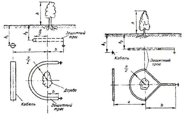 Рис. 18.1. Схемы для перехвата токов молнии, попавших в дерево, с помощью защитного троса, проложенного в земле между кабелем и деревом: а - расстояние от центра дерева до кабеля; b - расстояние от оси, проходящей параллельно кабелю через дерево, до заземления; h1 - глубина заложения кабеля; h2 - глубина заложения защитного троса (0,4 м £ h1 < h; b ³ 2 м, если а ³ 10 м; b ³ 5, если 5 < а < 10 м; b ³ 10, если а £ 5 м) ПРОКЛАДКА И СРАЩИВАНИЕ ЗАЩИТНЫХ ПРОВОДОВ18.16. Количество защитных проводов (стальных канатов), их тип и способ прокладки определяются проектом. 18.17. Основным типом защитного провода от влияния ВЛ и эл. ж. д. для прокладки на небольшой длине (до 1 - 2 км) является медный провод марки М-50 (сечением 50 мм2). Можно применять провода меньшего сечения, что должно быть определено проектом. Так как эти провода одновременно защищают кабель и от ударов молнии, то условия их прокладки должны быть такими же, как и при прокладке грозозащитных проводов типа ПС-70. 18.18. Основным типом защитного провода от прямых ударов молнии является провод для воздушных линий электропередач ПС-70 сечением 70 мм2, свитый из отдельных стальных оцинкованных проволок. Провода ПС-70 могут быть заменены стальными оцинкованными проводами меньшего диаметра, а также биметаллическими проводами диаметром 3 - 4 мм в соответствии с данными, приведенными в табл. 18.6. Таблица 18.6 Эквивалентное количество защитных проводов